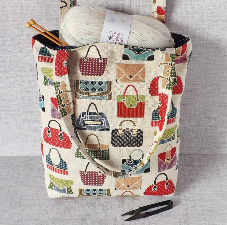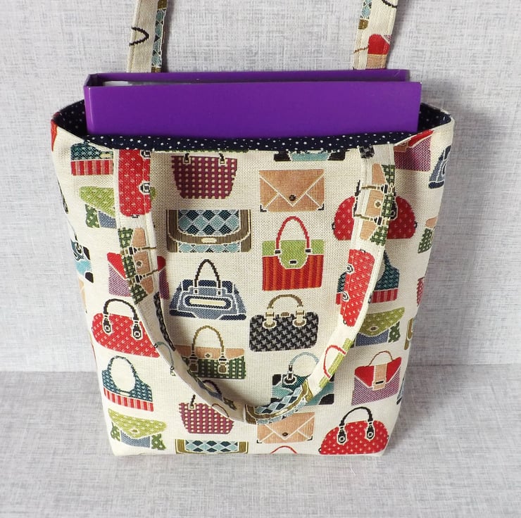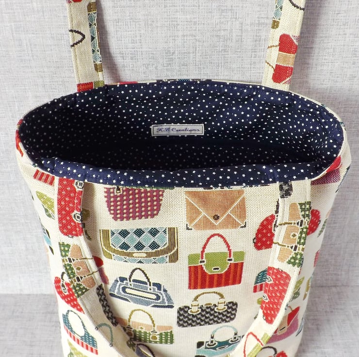 A medium sized strong tote bag/shopping bag made from tapestry style fabric with a handbags desgn in different styles & a variety of colours, on an off white background. The lining is a navy blue cotton with white stars on it & inside the bag are two slip pockets, ideal for you shopping list, phone, keys etc.