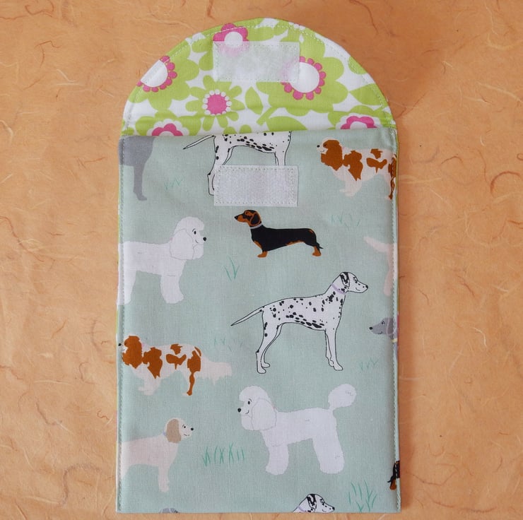 This beautiful dog themed kindle case is designed to fit kindle and kindle paperwhite, but please check the size of your gadget as there are so many variations. This is made from good quality cotton fabric featuring a selection of family dogs, including a poodle, Dalmatian and dachshund. It has a layer of wadding for protection and a floral lining. The case fastens with Velcro.