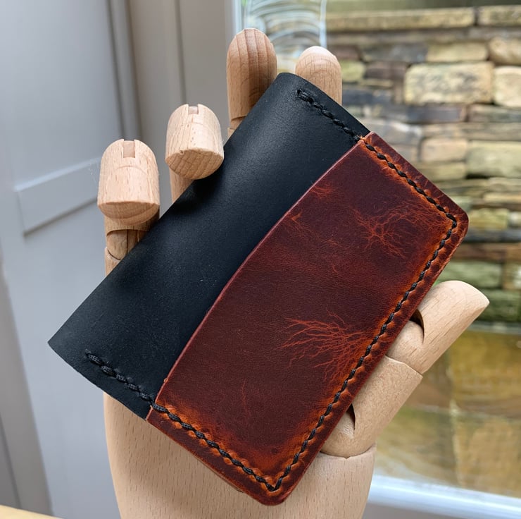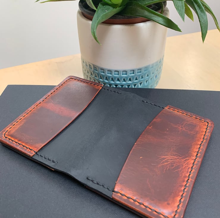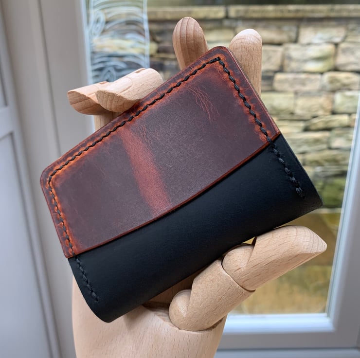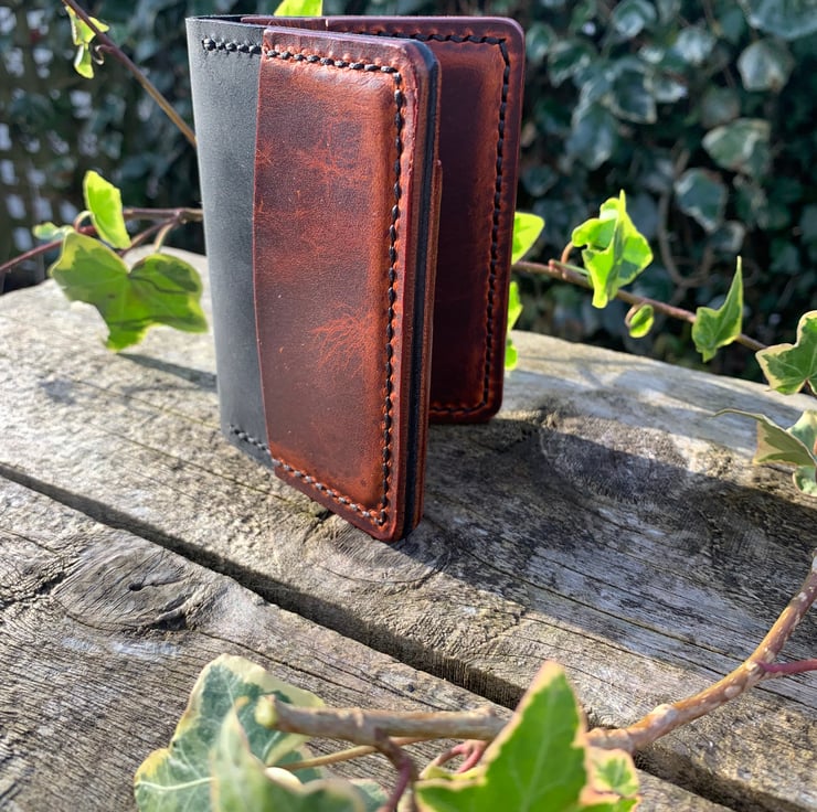 The Monty wallet is handcrafted using the finest veg tanned waxed leather from the world renowned Badalassi Carlo tannery in a rich cognac colour it has the most incredible pull up or lightening effect which gives the leather a distressed look when pulled or folded. This is complimented with a vintage look black crazy horse leather.