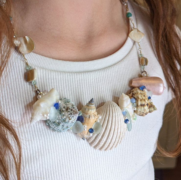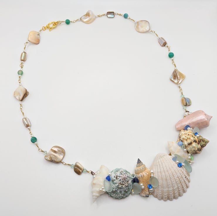 Stunning statement necklace set on a brass base which is nickel free. Adorned with shells, vintage Swarovski crystals, hand picked seaglass in beautiful soft blues and small deep blue and finished with tiny pearls.