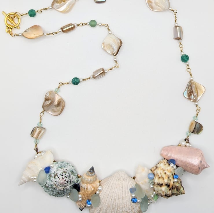 The necklace hangs on a hand made gold plated wire wrapped chain with irridescent shells and cracked, frosted agate beads and pearls.