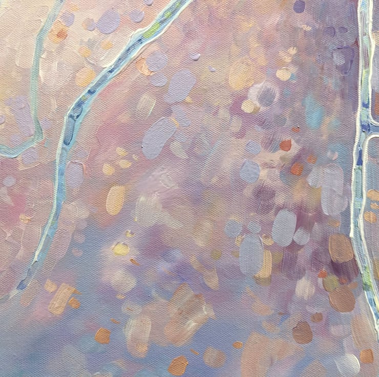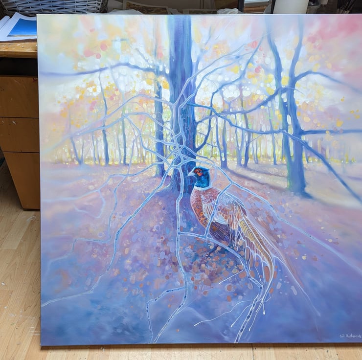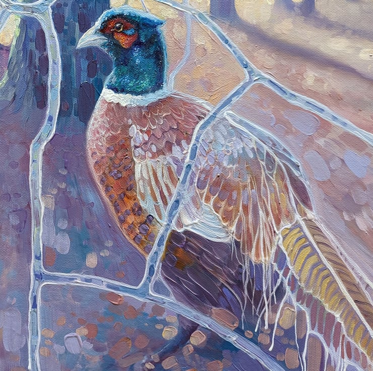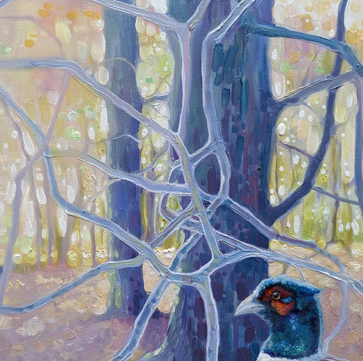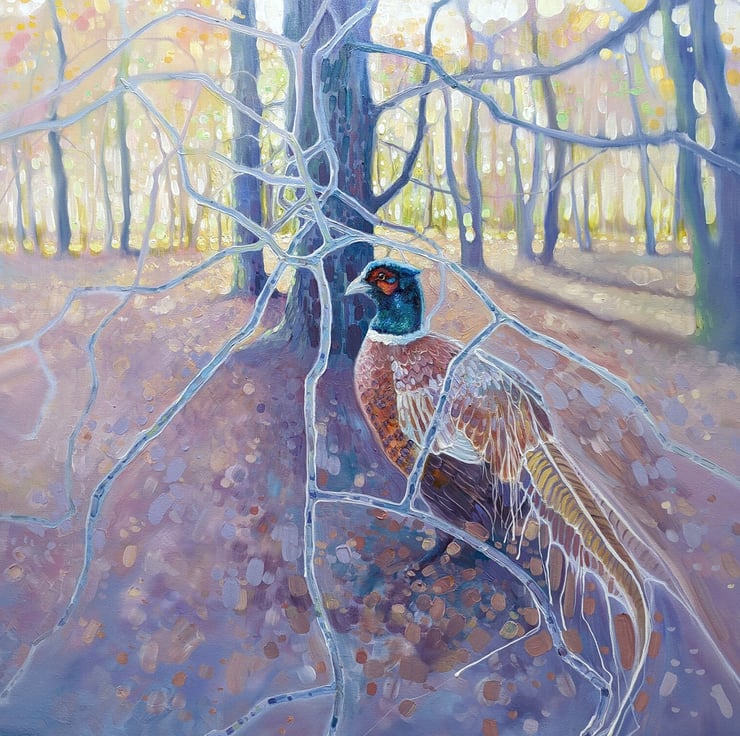 A Day in December is a large oil painting of a pheasant in a winter woodland. It is 40x40x1.5 inches. The painting is impressionistic, art nouveau and contemporary in style and was inspired by a winter walk I took in Friston Forest, East Sussex. The trees were almost leafless but still had a glow of golds and greens when the sun shone on them. The light beams through the trees were low and lit up the pinks and peach colours of the forest floor leaving the shadows purple and blue. The pheasant contains the colours around him and is very much a part of the landscape (Pheasants look too colourful for an English woodland and yet somehow, they can blend into the colours around them when they want to which fascinates me). This particular part of the forest is a favourite of mine as still retains a faintly ethereal and magical quality. Dedicated to everyone who works to keep the South Downs landscapes and wildlife unmolested. Painted on deep edge canvas, no frame needed, ready to hang and comes with certificate of authenticity.