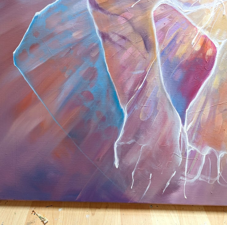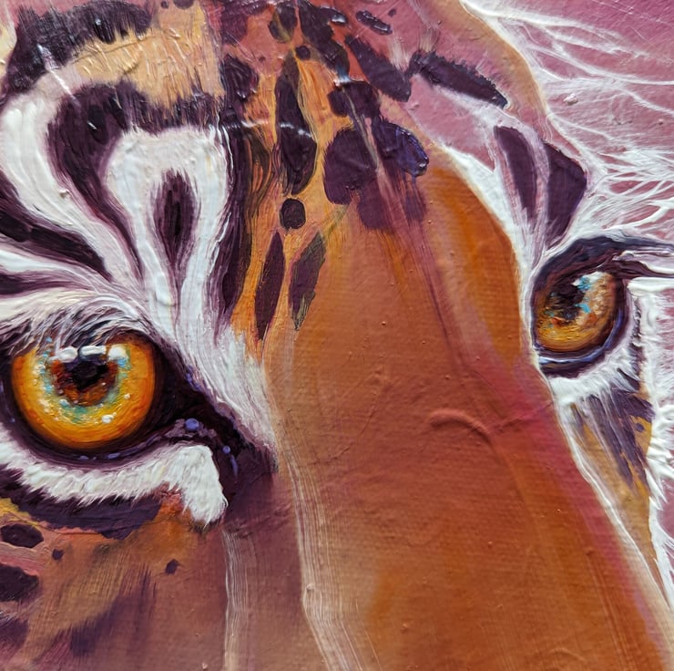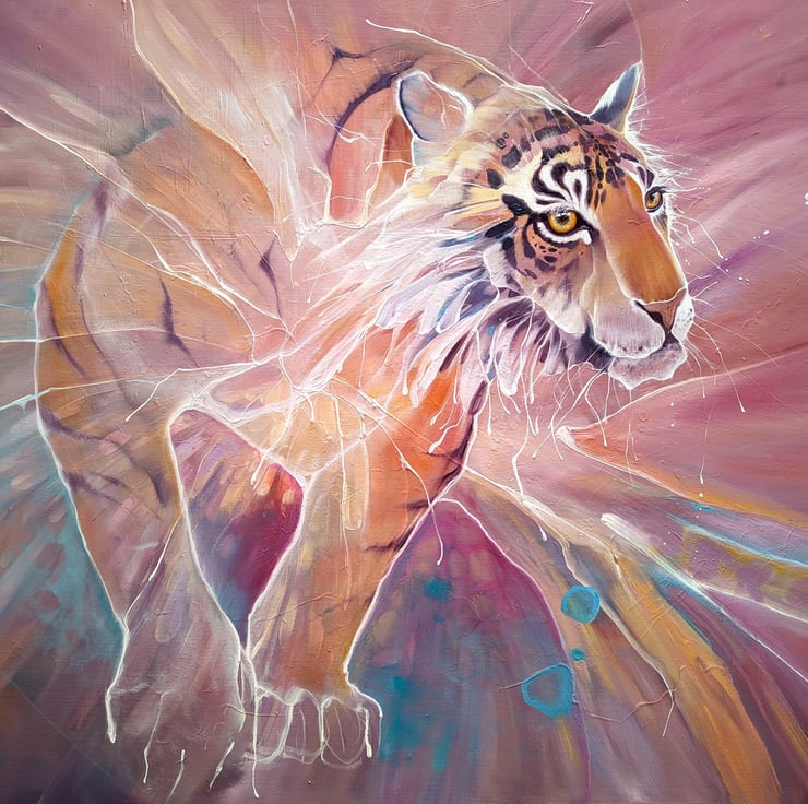 Tiger Materializing is a large semi-abstract oil painting of a tiger appearing out of a vibrantly coloured background. It is 48x36x1.5 inches. The background is highly textured (as there is another painting beneath it which did not work) and I decided to see what I could create out of the texture created from that one. It was almost like sculpting and what eventually materialized was a tigress. She is beautiful and lethal and is a powerfully muscled creature though I have deliberately avoided being too precise with her anatomy and fur. The inspiration behind it being simply a celebration of how beautiful tigers are and what a tragedy it would be to lose them from the world. It is more abstract than my usual style but does contain my favourite colours and the contrast I like to make between traditional vs abstract. This, for me, makes the painting much more interesting than some wildlife style tiger paintings as it shows the spiritual energy of the tiger in addition to its distinctive fur patterns. Dedicated to all those people who are working to protect and save wildlife and their habitats. Please keep doing what you are doing.