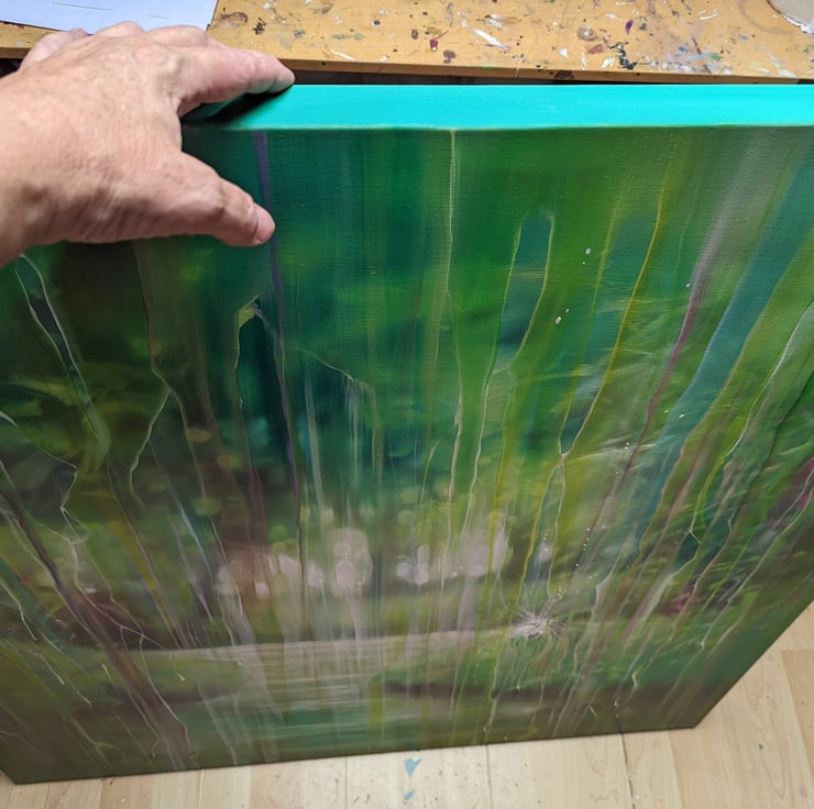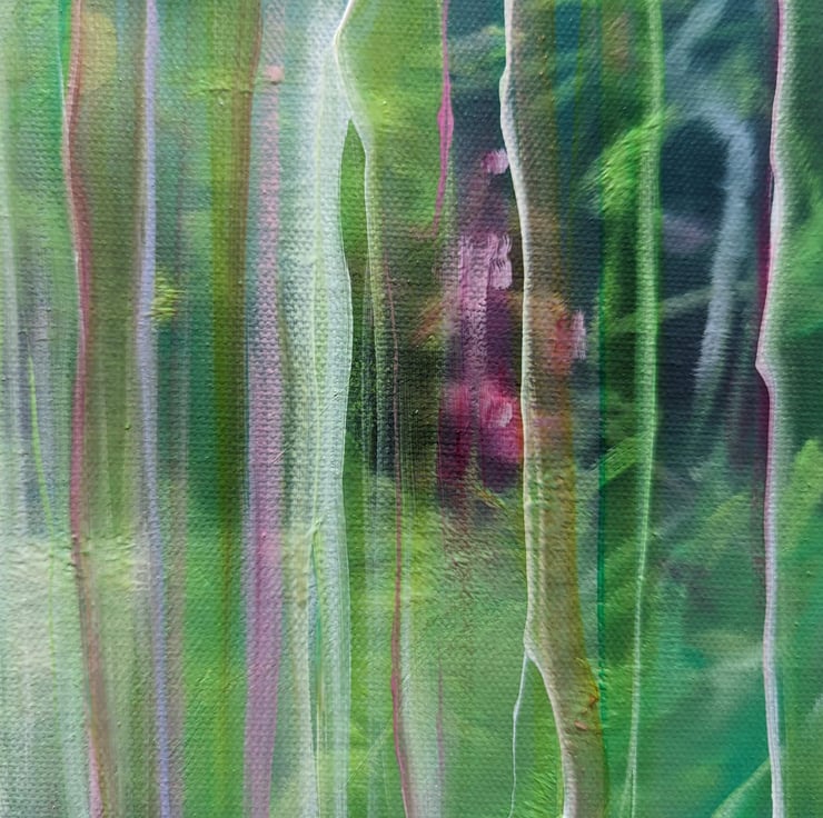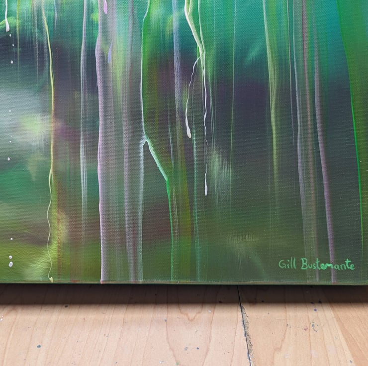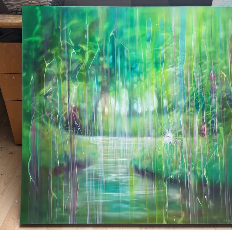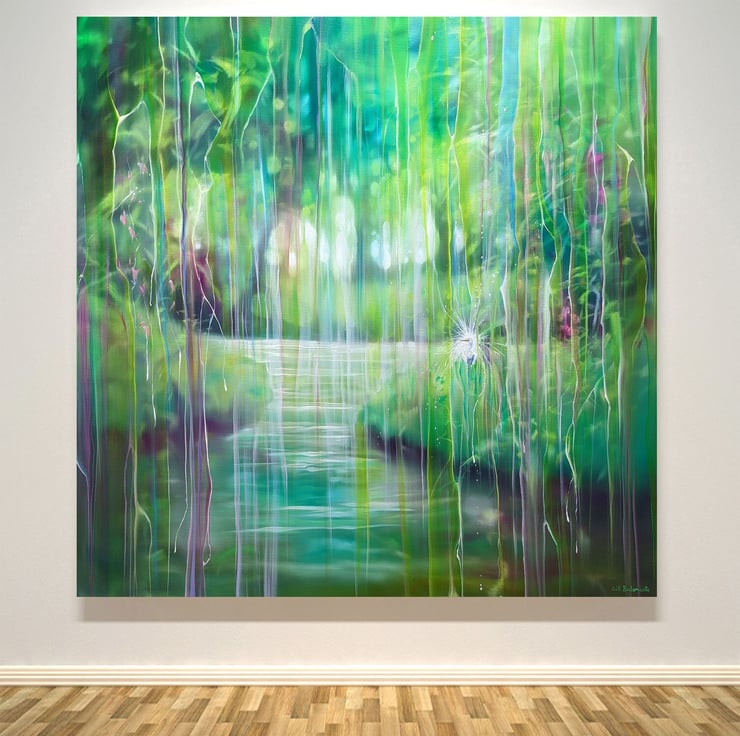 Emanation is a semi-abstract contemporary landscape oil painting of a white egret on a river bank with green trees and pink wildflowers. It is 36x36x1.5 inches and is predominantly green. It was painted using many transparent layers of paint that give it a magical aspect as it appears to be shimmering in and out of reality hence the title. The egret sits on the right bank of the river flexing and shaking her wispy feathers and there is a feeling of having come across her but she has not yet seen us. She was painted using thick white paint which is merging with the others layer of the painting. The inspiration was a walk I took along the river Medway near Tunbridge Wells in June where white egrets can often be seen against the green willows and riverbank reeds and flowers. Despite this being quite a common sight, these birds are very beautiful and it always feels like a treat to see them. This a tribute to the luscious greens of June in the countryside and the wildlife you can spot as you walk along rivers. It is painted on deep edge canvas, green edges, ready to hang, no frame needed and comes with a certificate of authenticity.