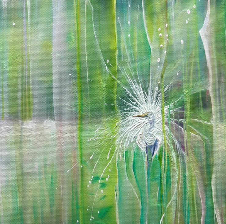 Emanation is a semi-abstract contemporary landscape with a white egret on green