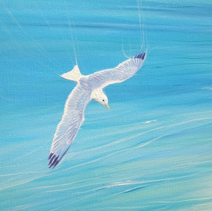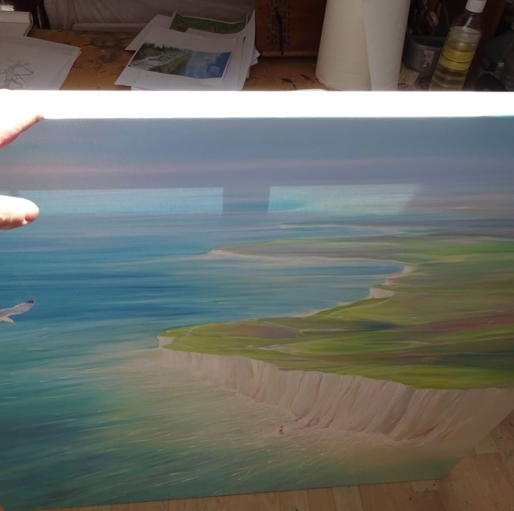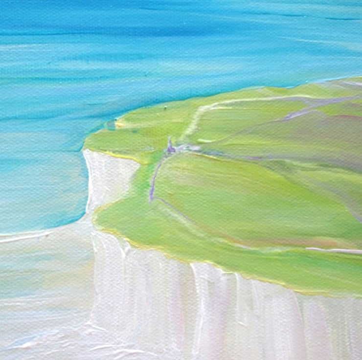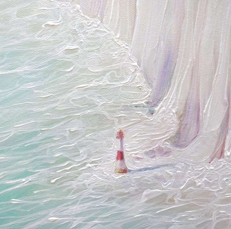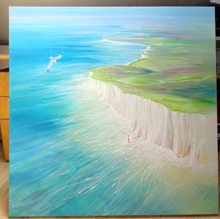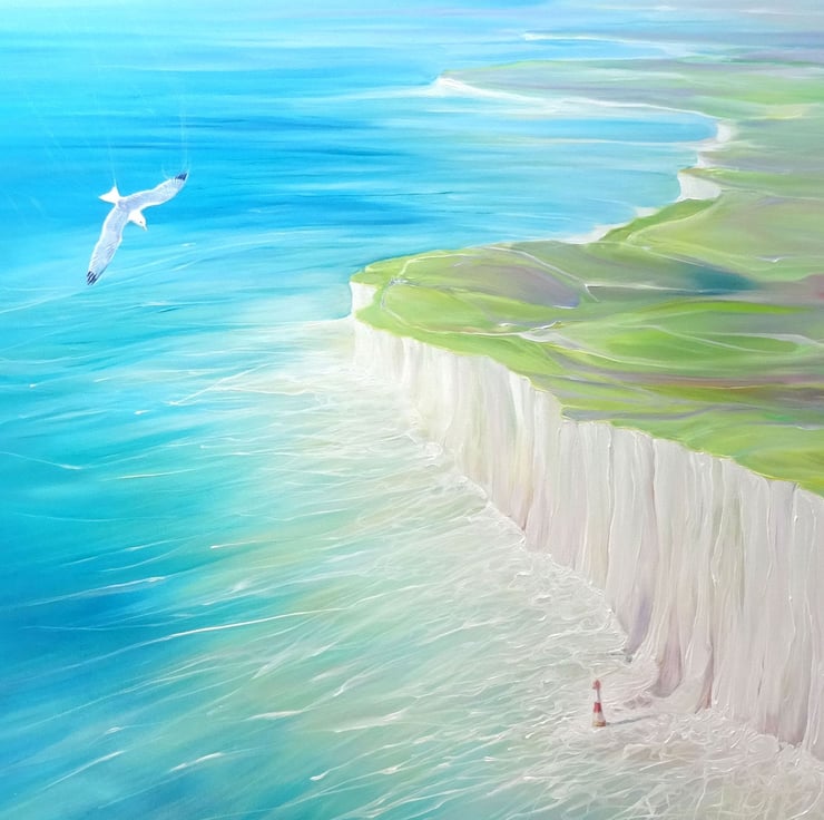 Coming Home is a large square seascape painting of the sea, Seven Sisters chalk cliffs and the lighthouse at Eastbourne in East Sussex. It is 40x40x1.5 inches on white deep edge canvas. The sea is very blue and you can see the land fading off into a purple haze in the distance towards Seaford. A single seagull is returning home. This painting was inspired by the many times I have walked along these cliffs from Eastbourne over to Birling Gap. The sea is turquoise near the cliffs where it is affected by the colour of the rocks underneath it and is deeper blue as you go further out. Paint has been used liberally especially on the cliffs to give an idea of the texture. Dripples of white from the base of the cliffs hint at the motion of the sea and the erosion that is occurring because of it. This landscape is a great place to see for miles around over a beautiful sea and one I visited regularly to keep me happy during the covid lockdowns. No frame needed, ready to hang. Dedicated everyone loves to walk and who is active in preserving nature.
