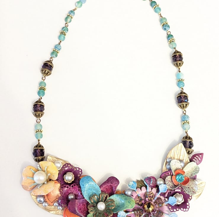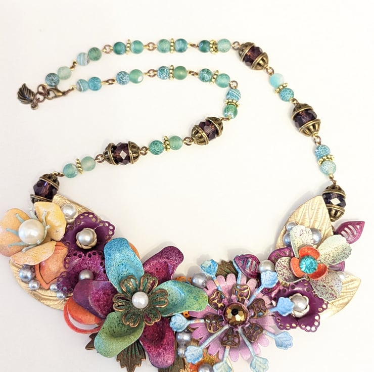 Stunning floral necklace. A real stand out, statement piece. Brass flowers on a brass back, nickel free. Hand made chain, made using Swarovski crystals and cracked, frosted Agate beads in a gorgeous green to compliment the flower colours.