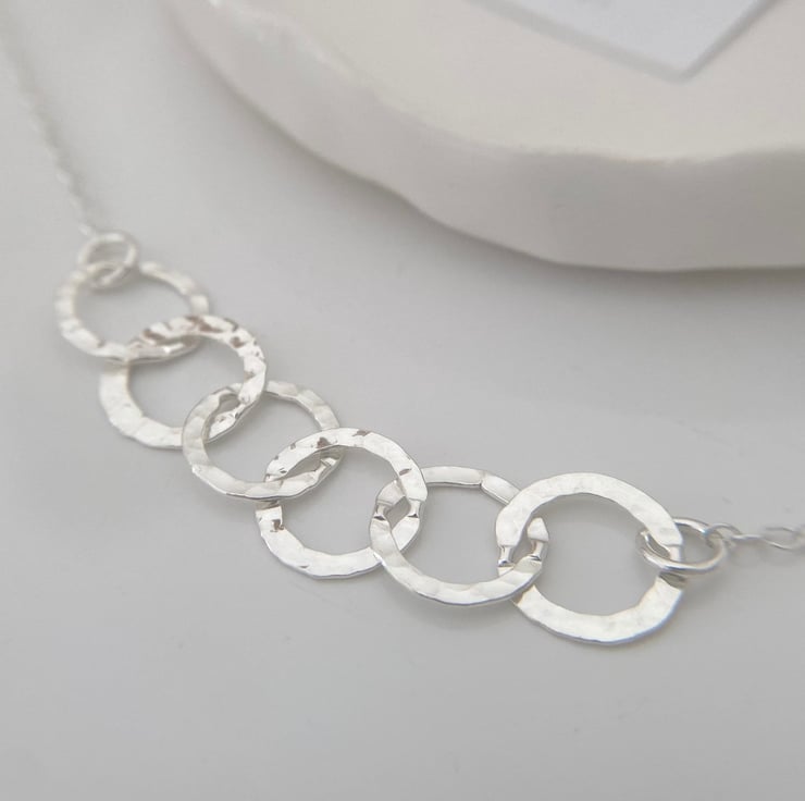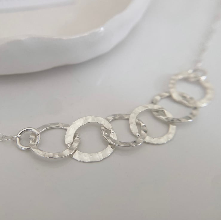 Each individual link has a hammered finish and measures approximately 11mm wide x 10.5mm in length. The linked rings are designed with small indents so that they slot into one another. The feature links are attached to a delicate 1.7mm trace chain with a bolt ring clasp.
