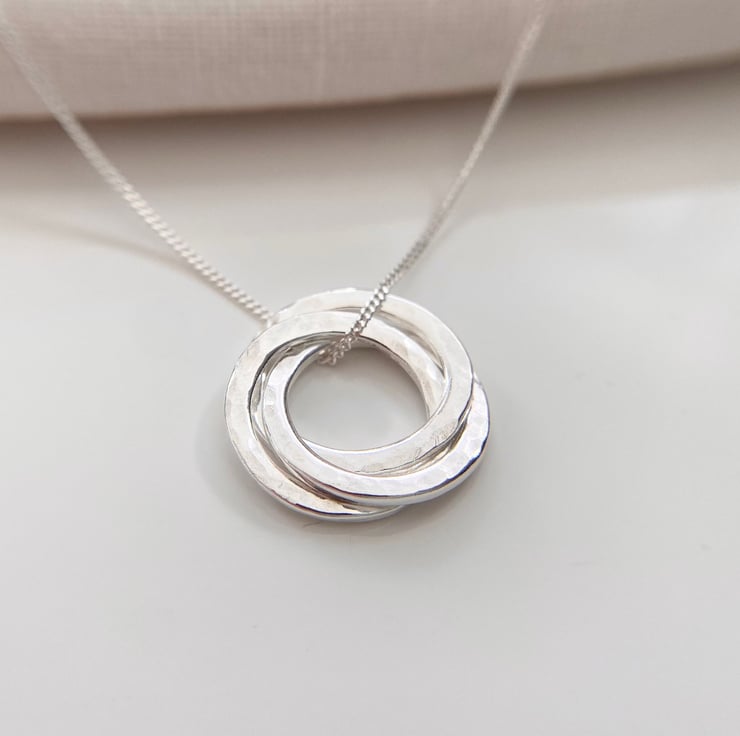 This sterling silver necklace features three interlocking rings each with a hammered finish. The rings sit directly upon a delicate sterling silver, diamond cut curb chain.