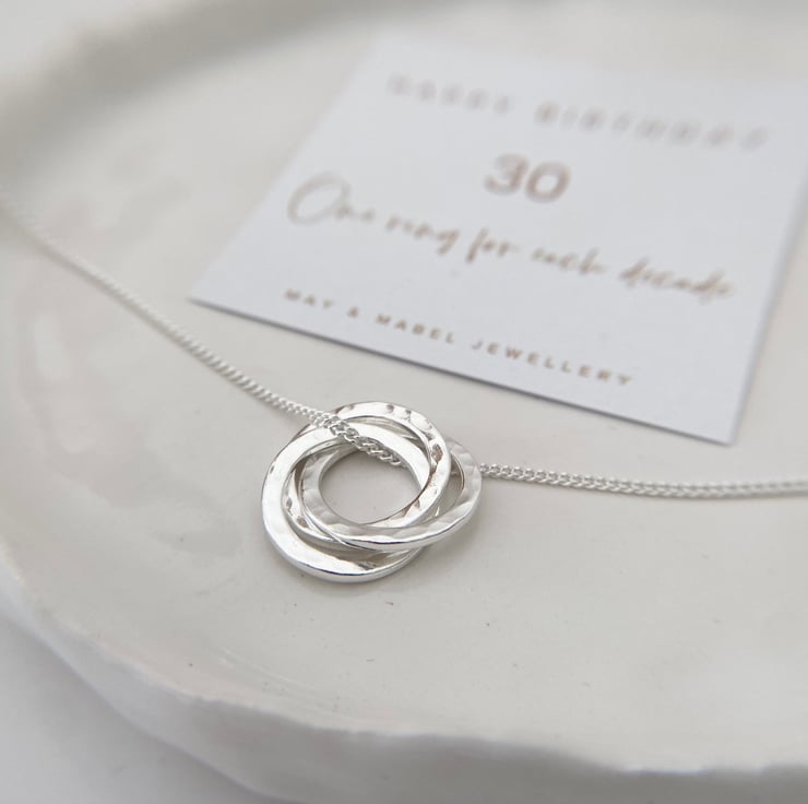 This piece makes a beautiful gift that could represent one ring for each decade on a milestone birthday, three family members, a friendship group or three generations.