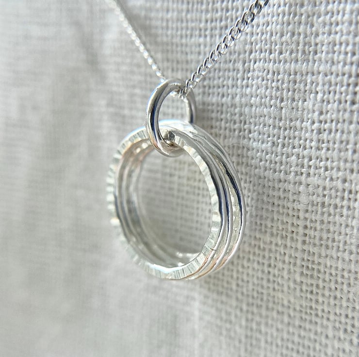 A very petite and dainty silver necklace, featuring four small line textured rings, suspended independently (not interlinked) on a delicate sterling silver, diamond cut curb chain, connected by a tiny sterling silver ring.