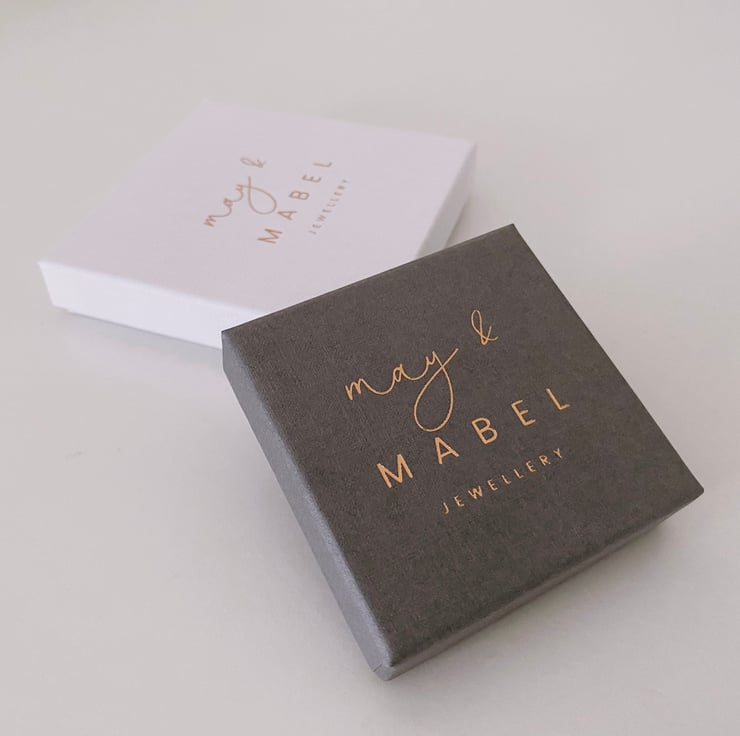 Your item will be packaged in a May & Mabel gift box. Boxes will be anthracite grey or white in colour and are either stickered or embossed with a May & Mabel logo, subject to availability. Enclosed in each box will be an anti-tarnish paper strip to help prevent discolouration.