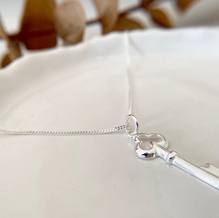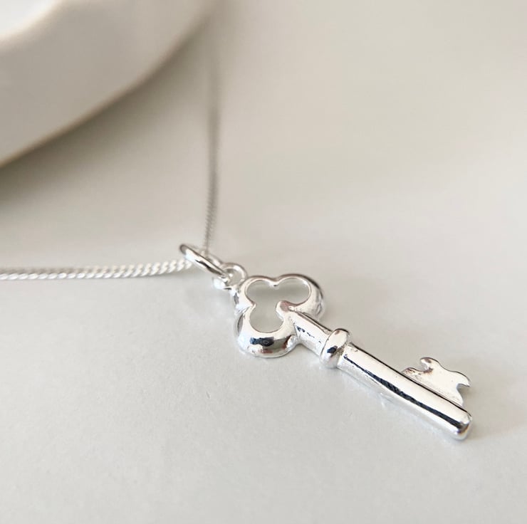 A sterling silver key pendant necklace.