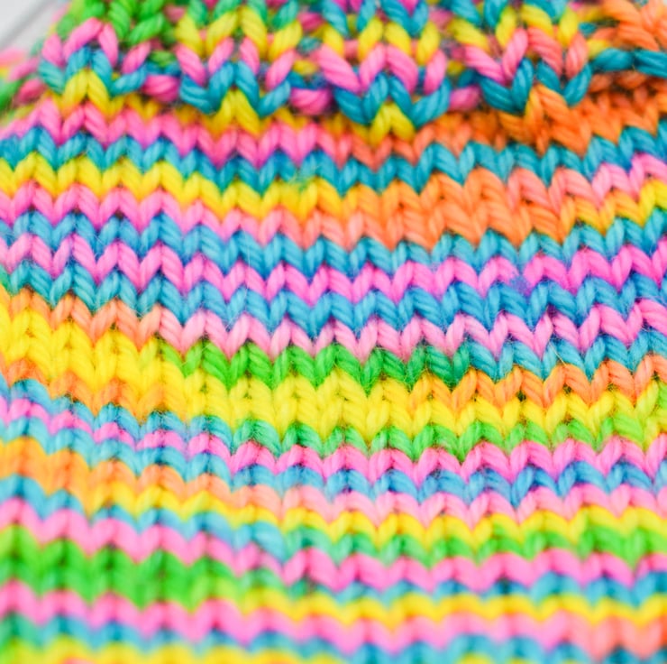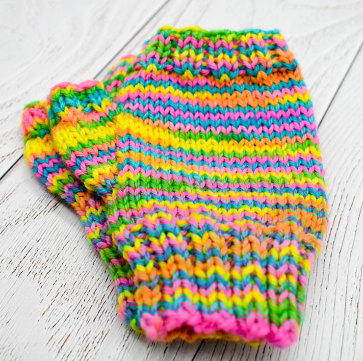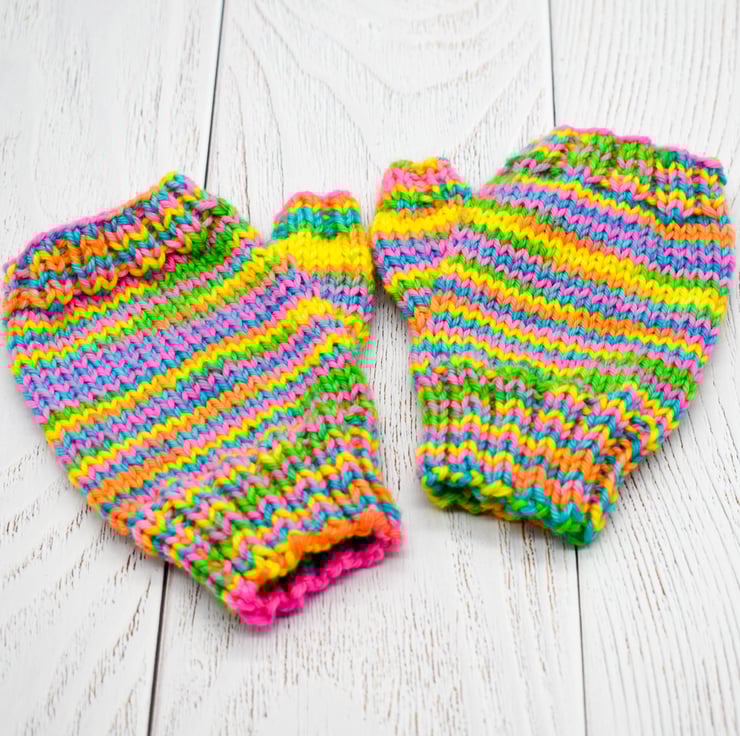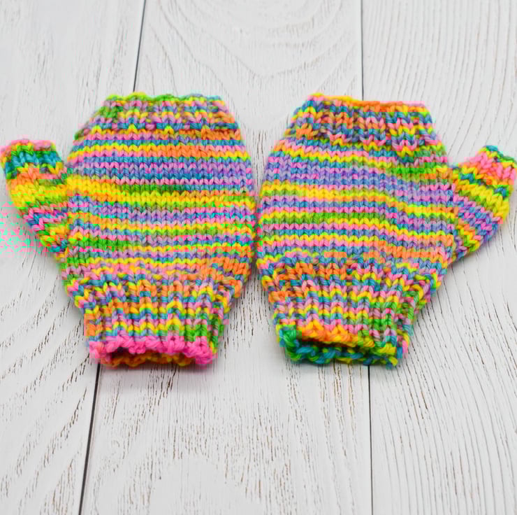 Knitted in brightly coloured wool these mittens are ideal for keeping busy little hands warm and being wool they are also hard wearing. This multicoloured yarn has shades of yellow, green, pink, orange and blue.
