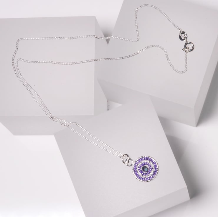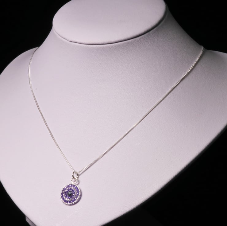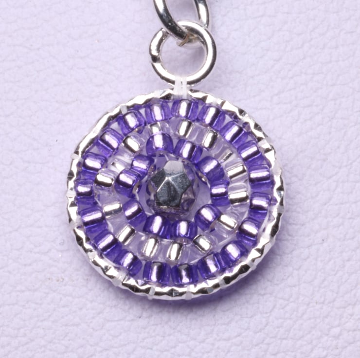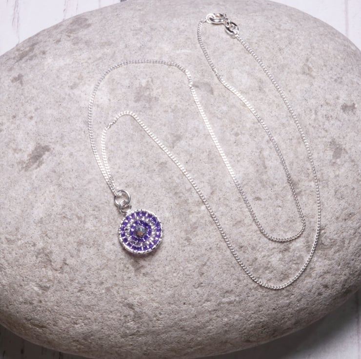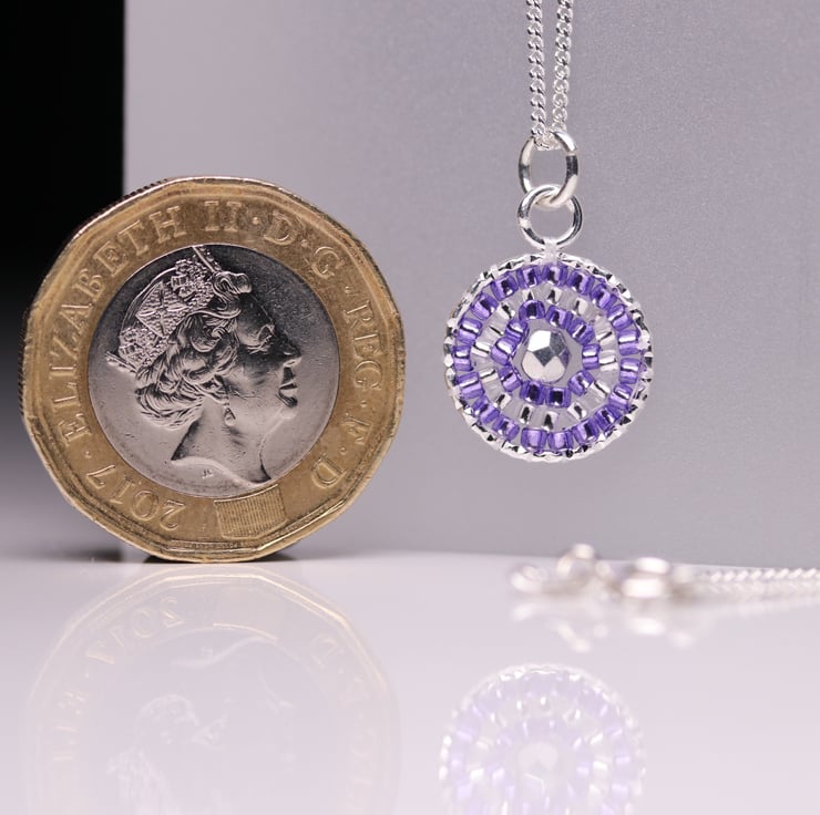 This pendant has been made using a process called beadweaving, by which the beads are sewn together with strong thread, not unlike fishing line. I have used size15 Toho silver lined purple and silver seed beads. All the metallic components in this pendant (apart from the central bead) are sterling silver. The centre bead is a 3mm Czech glass firepolish bead with a silvery coating.
