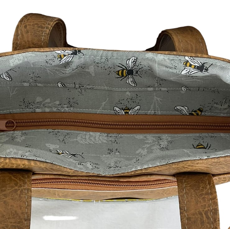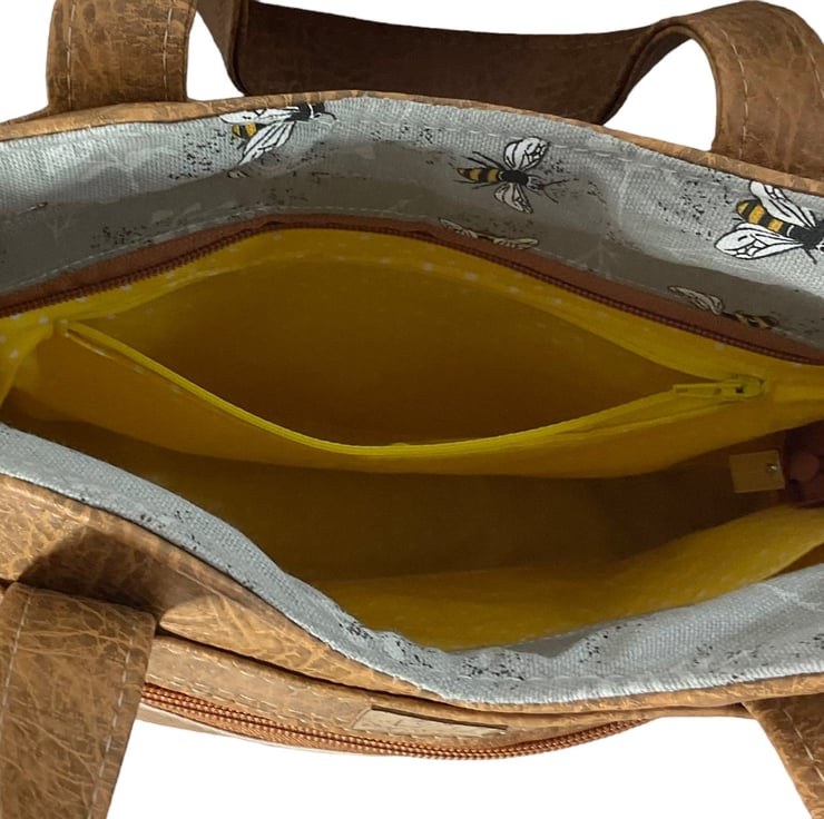Each of the bee print panels on the front and back are slip pockets, each divided into 2. The zips on the outer of the bag are caramel coloured , the inner zip is golden yellow.