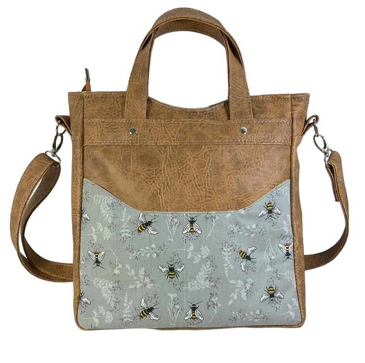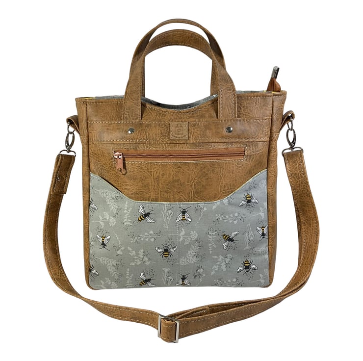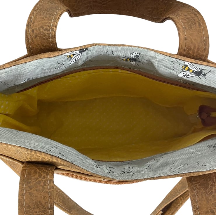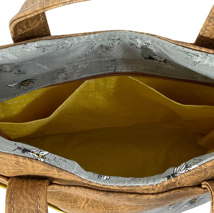 A medium to large sized handbag, with a deep gusset that extends all around the bag. Made in the loveliest heavier weight yellow bee print cotton canvas fabric, with a mid grey background for the feature slip pockets on the front and back, whilst the gusset, the main front and back panel front and the generous crossbody strap are all made in 2 tone caramel gold ochre brown faux leather vinyl.