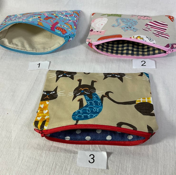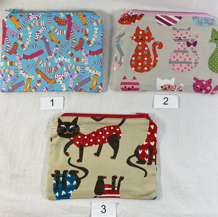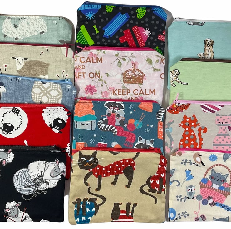 New bigger size! 16.5cm x 13cm ( 6.5 x 5 ) width by height, coin knitting notions sewing, small makeup whatever you need pouch, most have matching knittingcrafting bags available in my shop. Oh so handy for so many uses. Made in a variety of sheep, dog and cat print fabrics. Some pouches are entirely in heavy weight fabric, all are fully lined in it, so no raw edges and fraying bits! The pouches are interfaced to make them sturdier. The case securely closes with a coordinating zip (colour may vary). Cases are numbered .