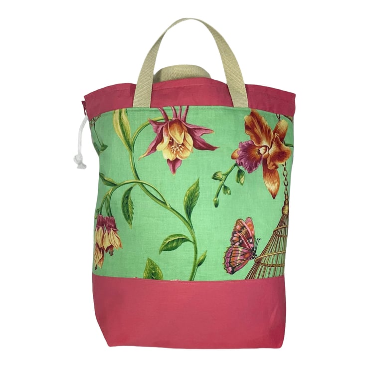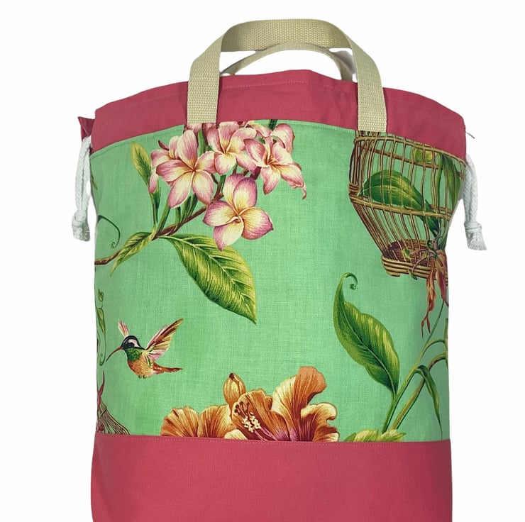 The main fabric is a gorgeous rare midweight cotton canvas that has the most unusual and unique print of huge pink and burnt orange flowers, hummingbirds and butterflies along with an ornate bird cage. This is on a light green base and I have paired it with a heavyweight salmon linen look cotton. Inside the bag is lined with a natural cotton and around the whole circumference are pockets in varying widths, a total of 5, 2 being perfect for needles up to approximately 28cm (11) in length , the others for notions, patterns etc. There is also a lobster clasp on webbing perfect for holding stitch markers or maybe keys.