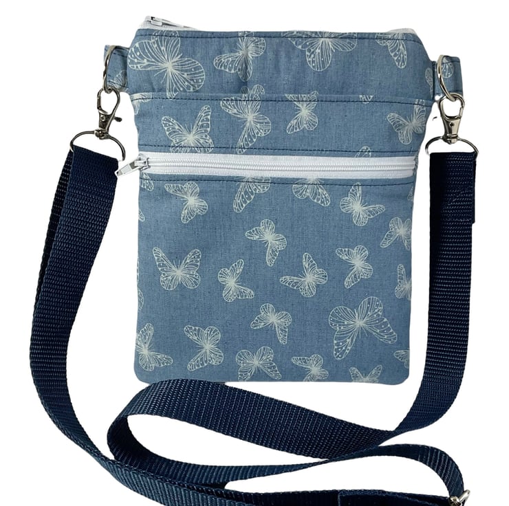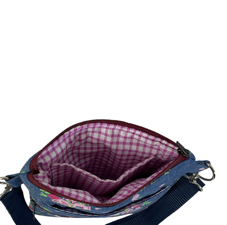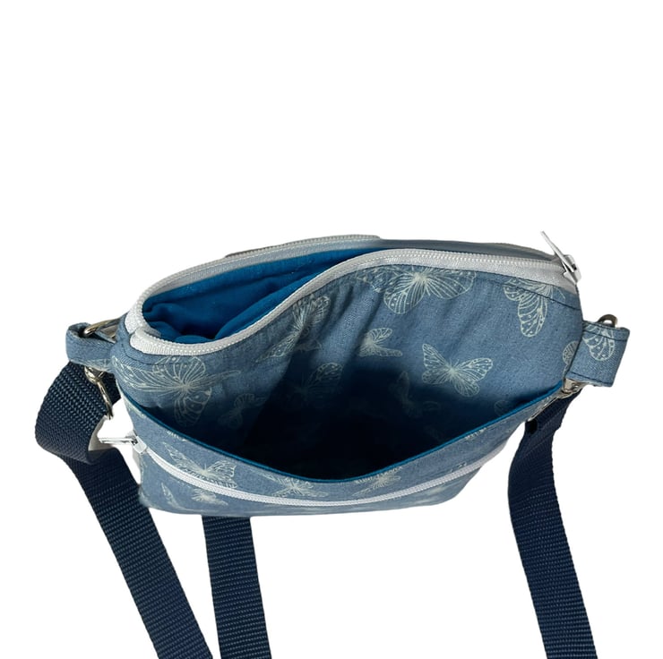 First we have the oh so pretty pink based small floral print on a denim blue base. This is lined in purple check on white cotton. Next is an attractive white line drawing butterflies on a slightly lighter blue base than the floral choice, this is lined in turquoise cotton. inside is a phone pocket that can hold my iphone 6 in its case. There are also another 2 pockets externally, one a full width slip and another zipped which is also full width. The strong nylon heavyweight webbing strap is in black and is fully detachable, it clips on with 2 swivel lanyard clips. The strap itself is approx 133cm (52.5") in length, long enough to go across your body and is fully adjustable. Each bag closes with a toning zip. The bag is fully wadded and interfaced for form and strength.
