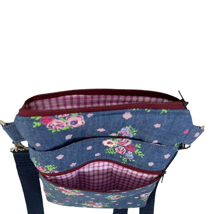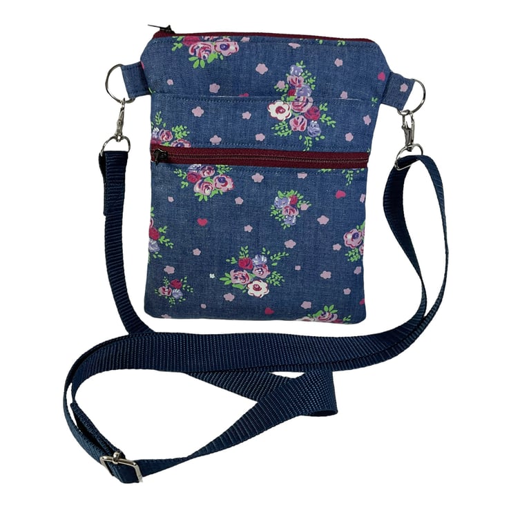 A choice of 2 fun and colourful print small phone sized shoulder bag made in a light weight denim . This handy bag is slim so sits close to your body, and will hold the basics when you want to grab a small bag for a trip out. I have managed to fit a purse, my phone (iPhone XS in a case) and a diary.