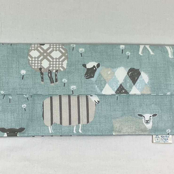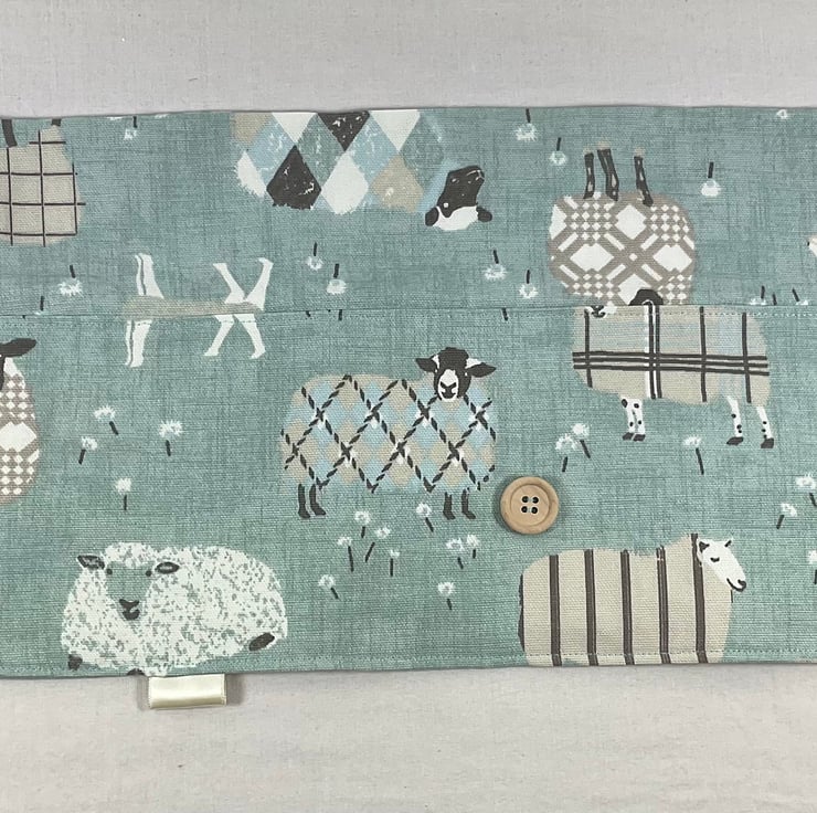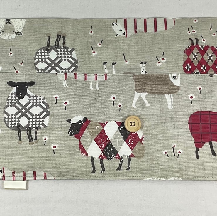 I have used a lovely sheep print linen look heavy weight fabric in main shades of turquoise blue, denim blue or red for the outer, flap and lower pocket and perfectly matching either denim blue, turquoise blue or light latte coffee heavyweight linen look cotton fabric ,all with white spots, to line the case and the upper needle pocket. The case is interfaced for structure and strength and topstitched all around for neatness.