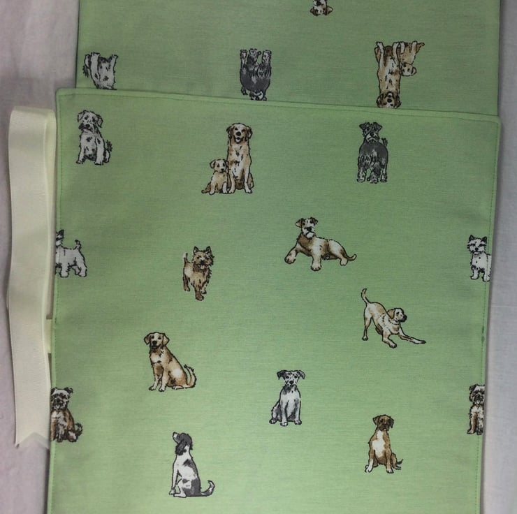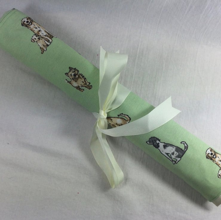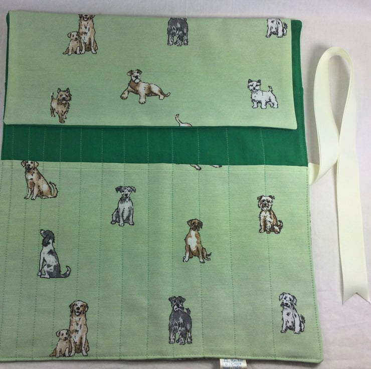 The case is in the cutest dog breeds print cotton on a light lime green background paired with a grass green cotton. In the print I think I have identified westies, cairn terriers, spaniels, boxers and retrievers .