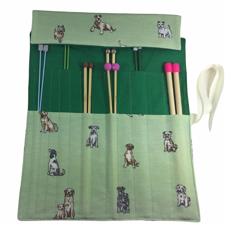 The case itself is interfaced for sturdiness and has 2 pockets, the lower pocket houses 13 sets of needles and above in the plain pocket is space for 13 more. There is a deep flap with matching fabrics and the entire case is topstitched for neatness. The case rolls up and is fastened by cream grosgrain ribbon. needles not included in sale. Pattern placement may vary.