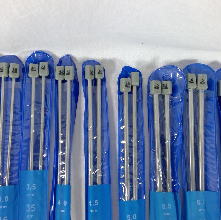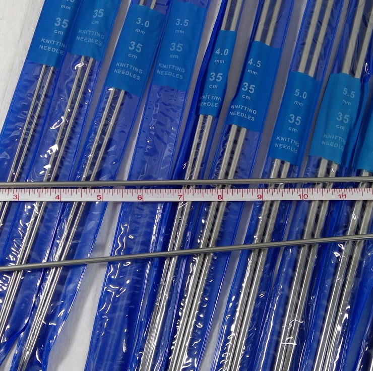 This full set of needles will set you up for many years of use. I use these needles myself and find them very nice. they are made from hollow stainless steel which is comfortable to handle and are extremely light in weight. The needles are a decent length at 35cm (14") and are printed and embossed at the end with the metric sizes. The ends are pointy, but not too sharp.