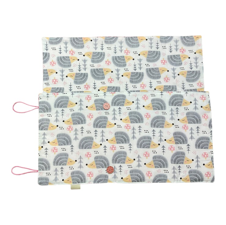 This case is made from The Cutest hedgehog print cotton in pastel pink, apricot, grey and white on a white background. The case can can also be used for straight needles up to 25.5cm (10") or maybe crochet hooks.