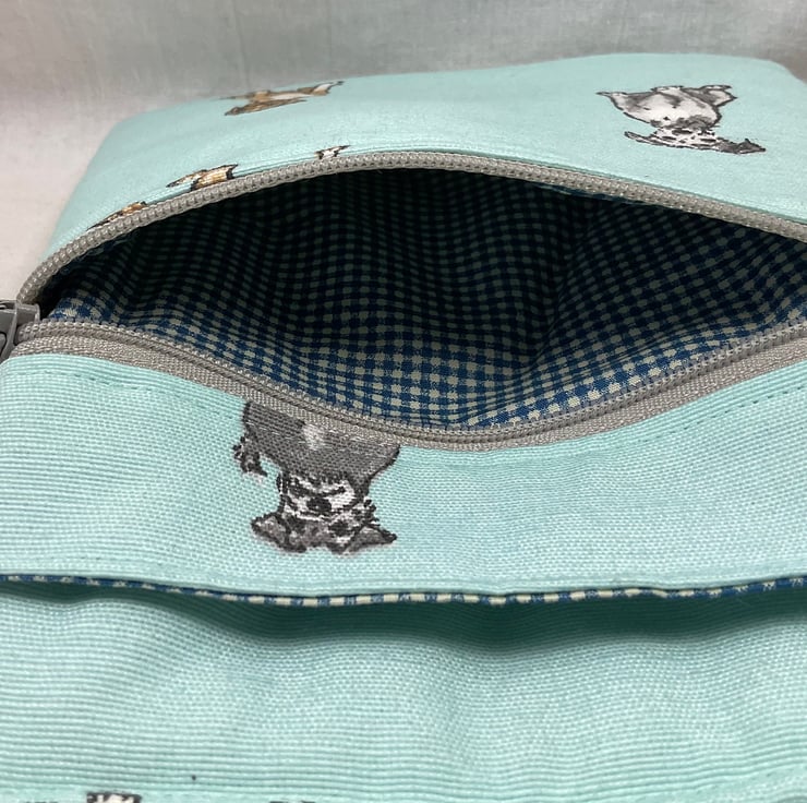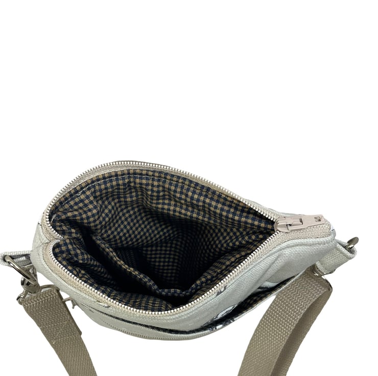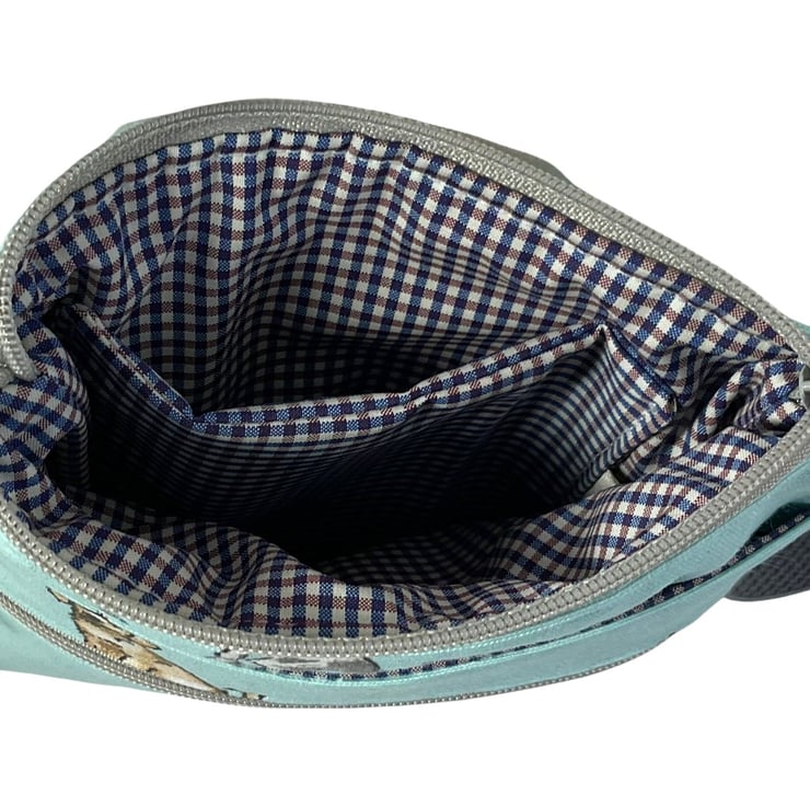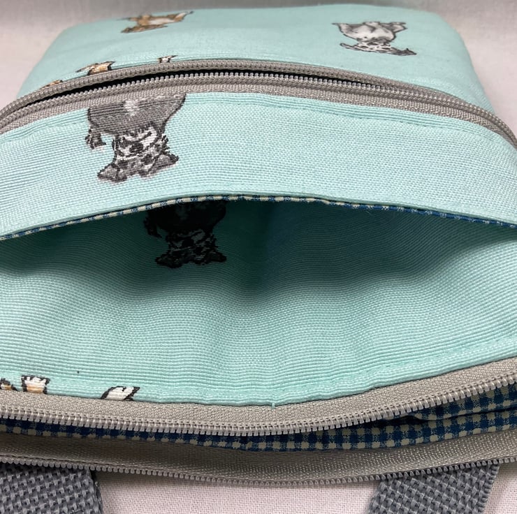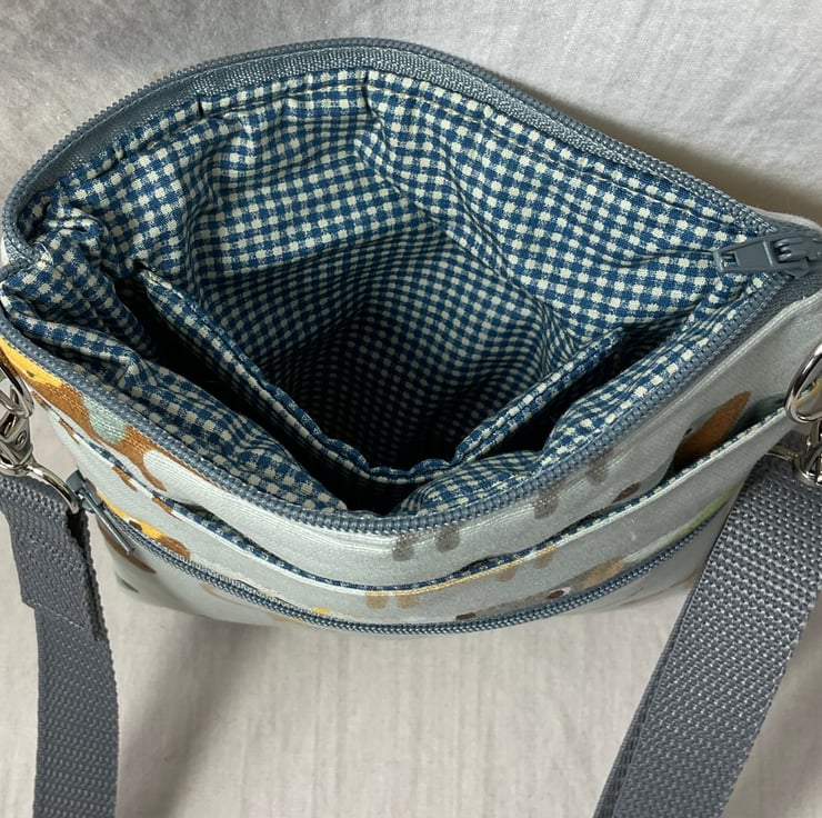 First we have a realistic dog print on a cafe latte base, this is lined in dark navy and white micro check. Next is another realistic print this time on a turquoise blue base and lined in the navy and red micro check cotton as above. Finally is a cute daschund print on a silver grey base, this again is lined in a mid blue micro check. inside is a phone pocket that can hold my iphone 6 in its case. There are also another 2 pockets externally, one a full width slip and another zipped which is also full width. The strong nylon heavyweight webbing strap is in black on The cafe latte based bag and mid grey on the other 2 and is fully detachable, it clips on with 2 swivel lanyard clips. The strap itself is approx 133cm (52.5") in length, long enough to go across your body and is fully adjustable. Each bag closes with a toning zip. The bag is fully wadded and interfaced for structure. Pattern placement may vary. contents shown for display and not included in sale.