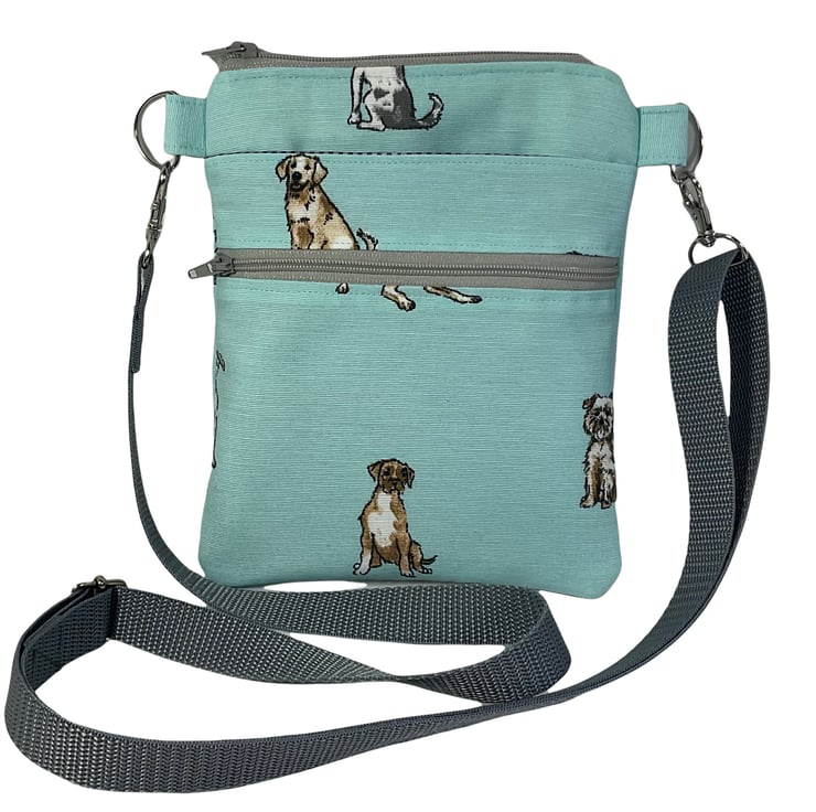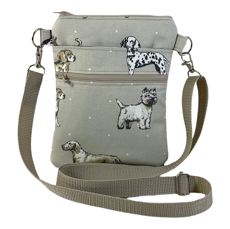 A choice of 3 cute dog print small phone sized shoulder bag ( numbers corresponding to each bag in photo 2) Made in heavyweight cotton canvas . This handy bag is slim so sits close to your body, and will hold the basics when you want to grab a small bag for a trip out. I have managed to fit a purse, my phone (iPhone XS in a case) and a diary.