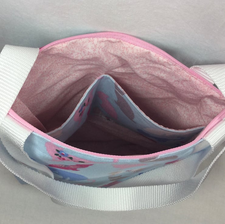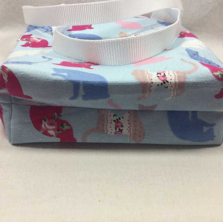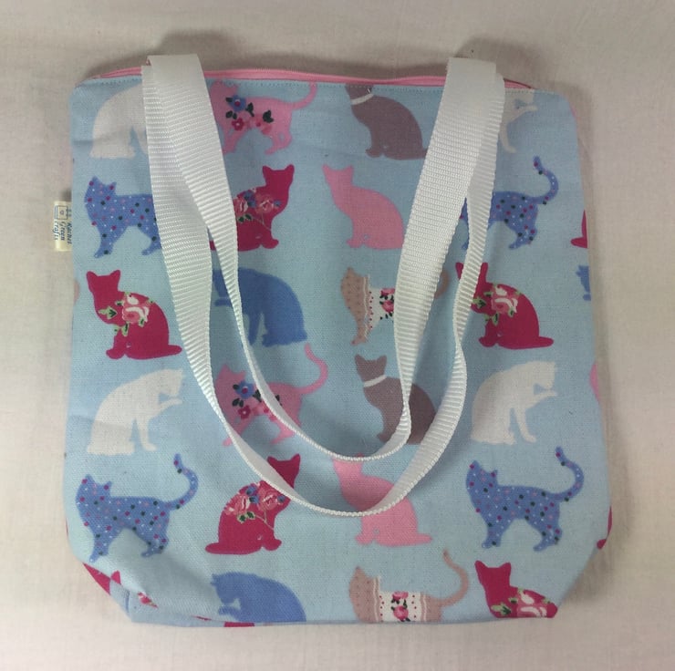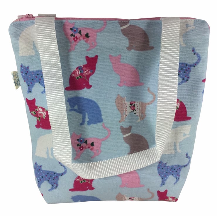 This bag is made from colourful heavy weight cat print On a pale blue coloured base. The bag is lined in pink ditsy foliage patterned cotton fabric. A full width set of slip pockets is made in the cat fabric and lined with the patterned, this is divided into 2. The bag has a boxed base and is fully interfaced for strength and form. The tote securely closes with a toning nylon zip. There are 2 decent length handles in strong nylon webbing in white.