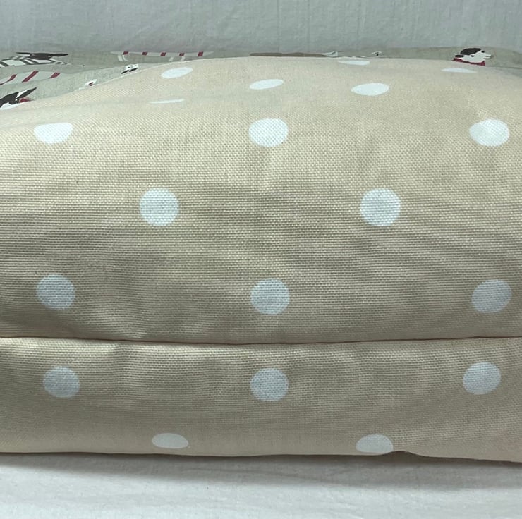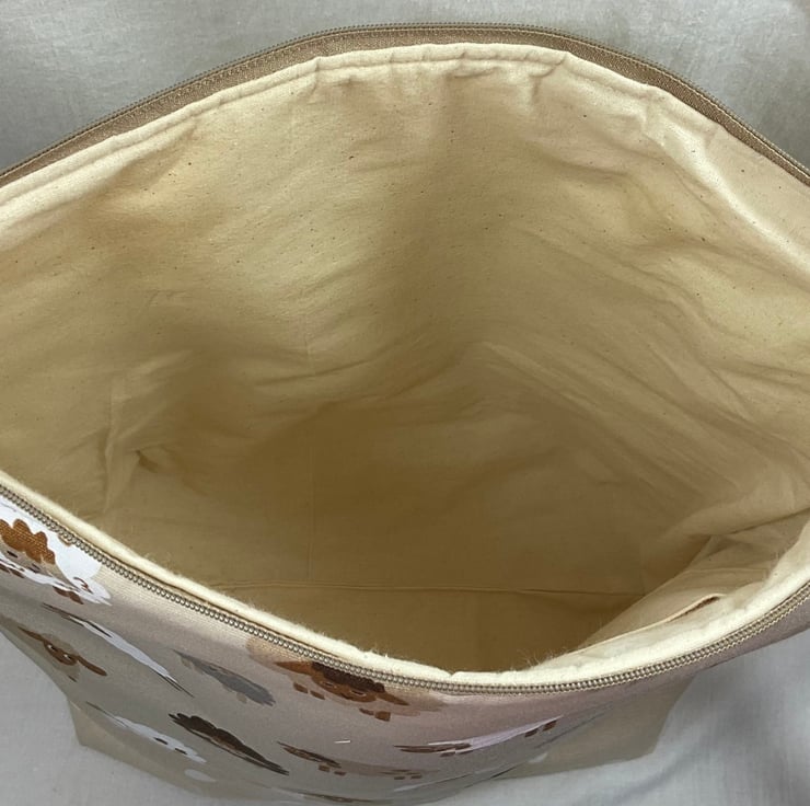 I have used quality heavyweight fabrics for this bag. The main is a cute natural tones sheep print and I have paired this with a coordinating light coffee with white spot canvas.