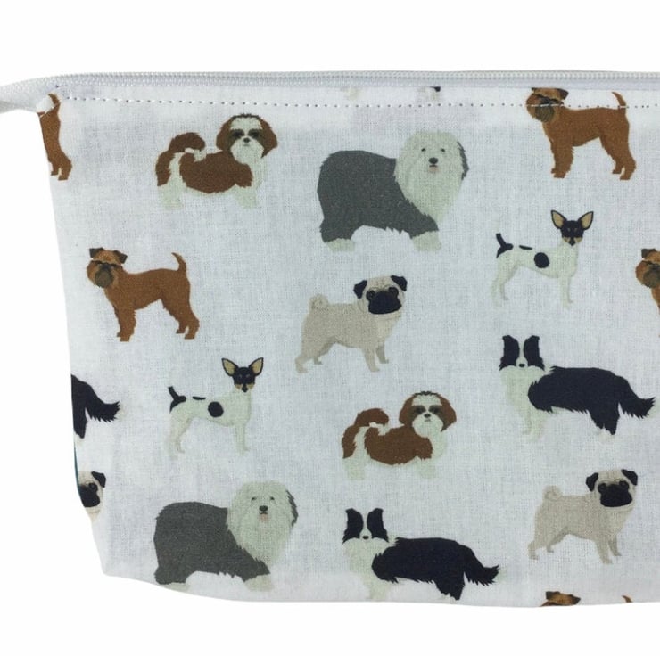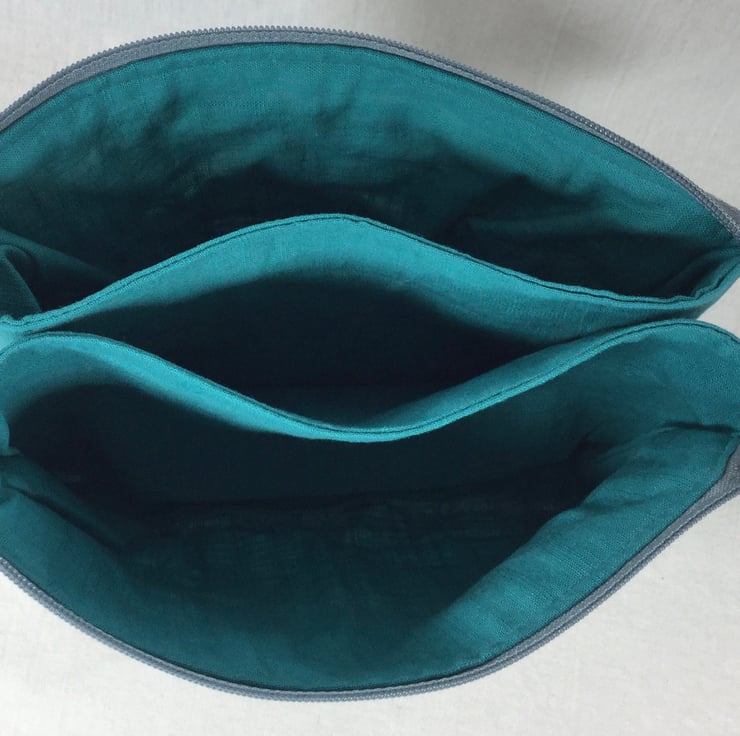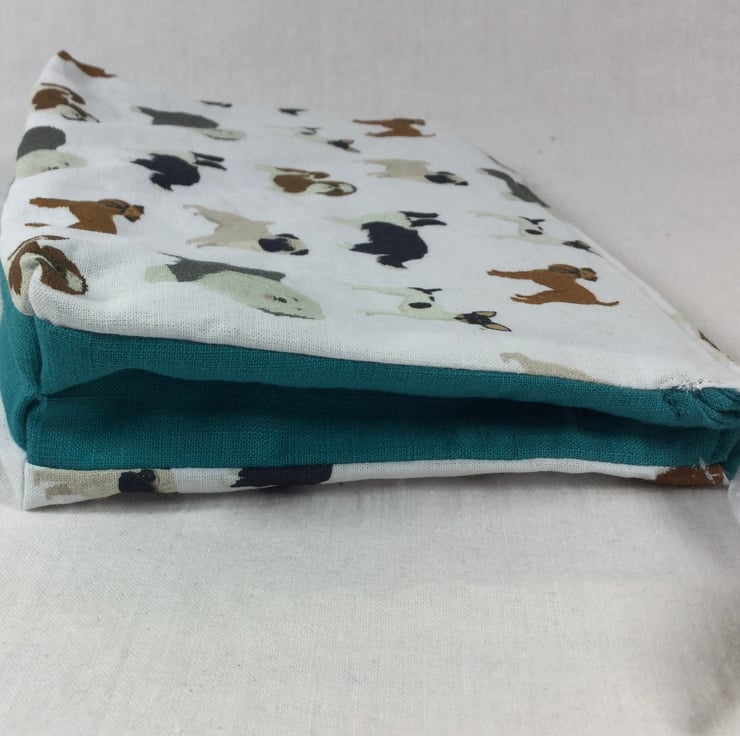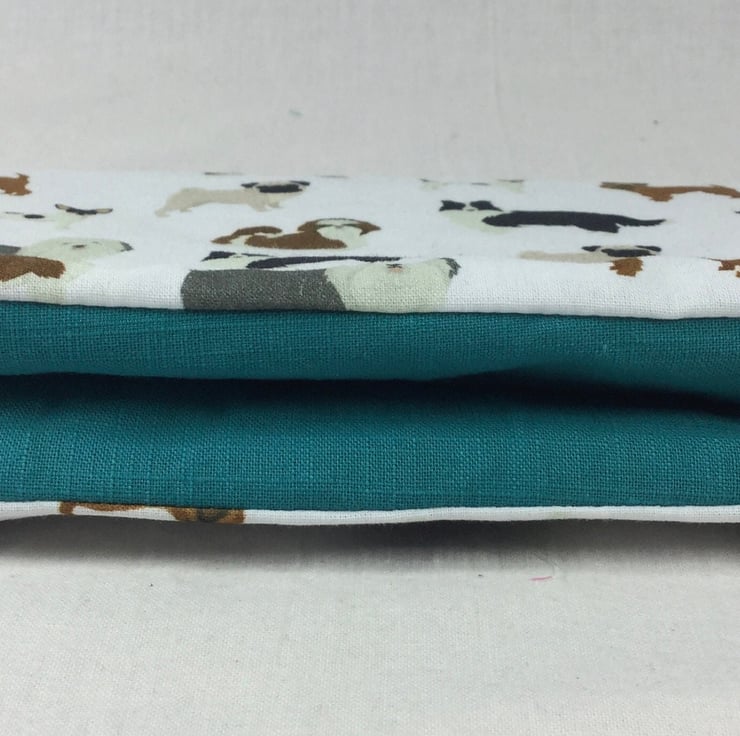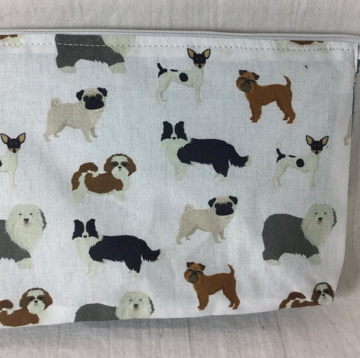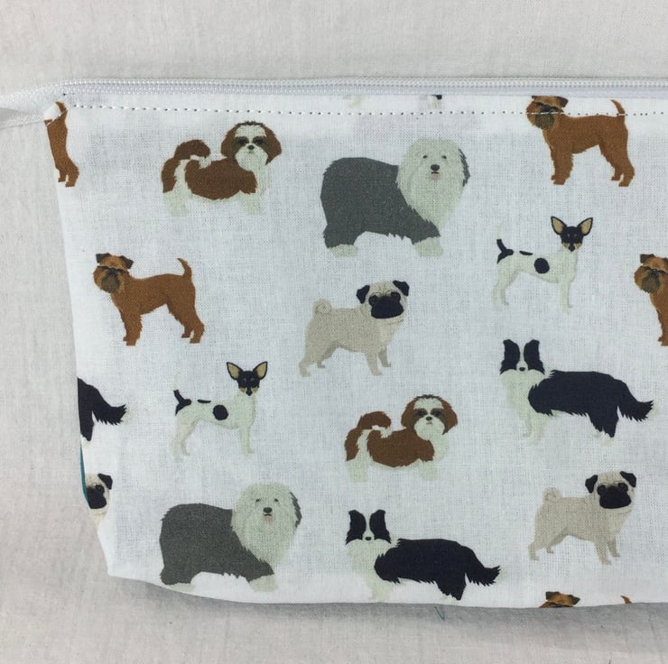 This clever design makes a bag with 3 roomy compartments that holds a surprising amount. This pouch is covered with a lovely dog breed print in natural shades, of which I recognise Old English Sheepdogs and Collies. it is lined in a teal blue green cotton. The bag is interfaced and fully lined and closes with a matching zip that opens fully.