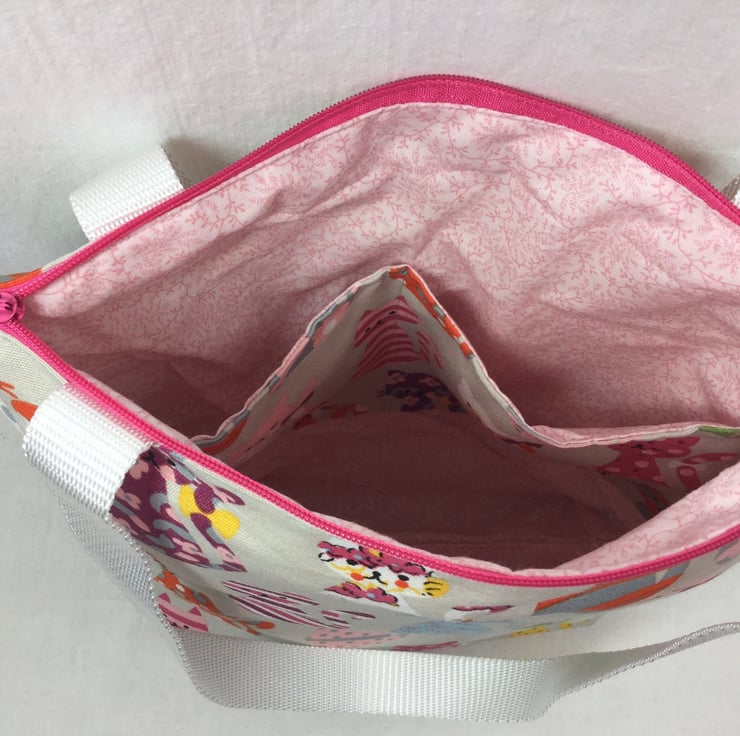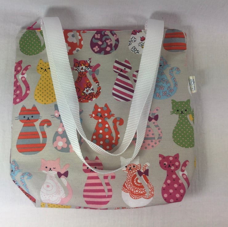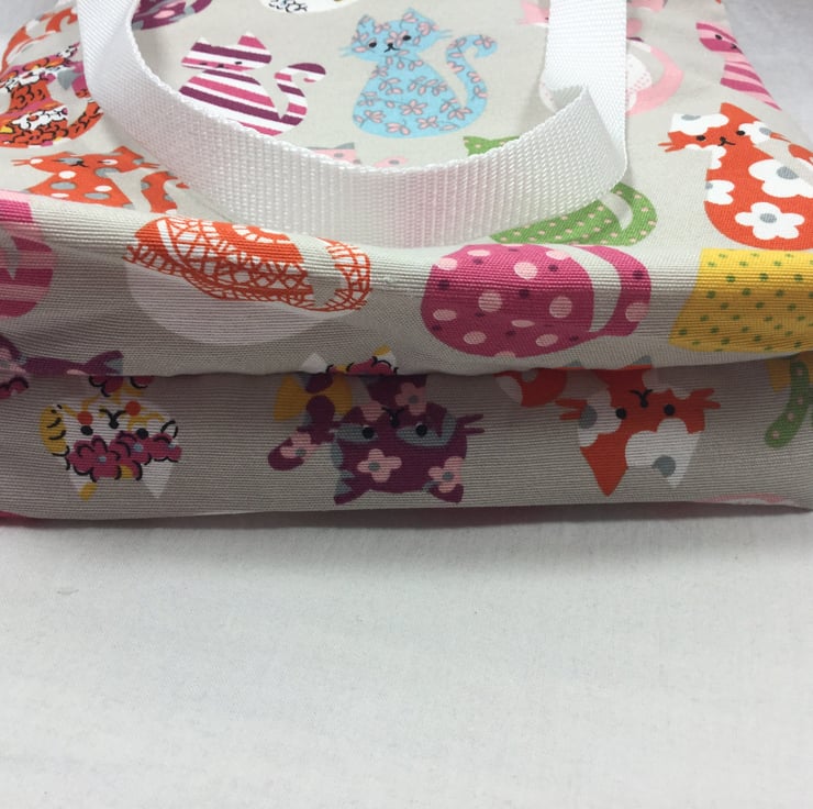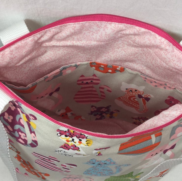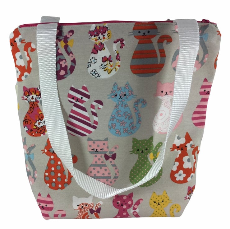 This bag is made from colourful midweight cat print On a cream coloured base. The bag is lined in pink ditsy foliage patterned cotton fabric. A full width set of slip pockets is made in the cat fabric and lined with the patterned, this is divided into 2. The bag has a boxed base and is fully interfaced for strength and form. The tote securely closes with a toning nylon zip. There are 2 decent length handles in strong nylon webbing in white.