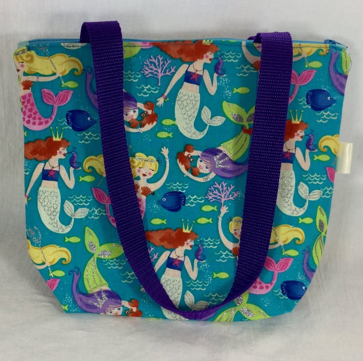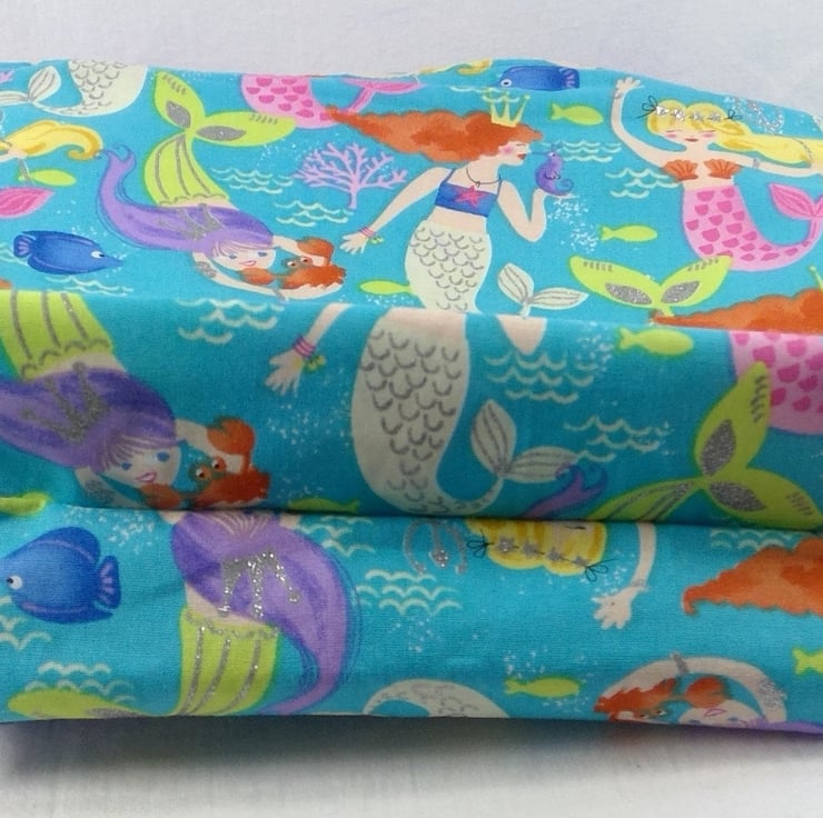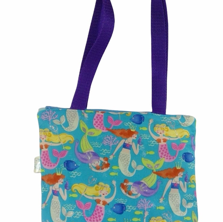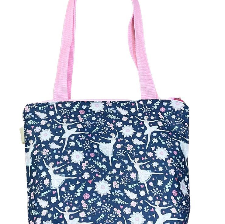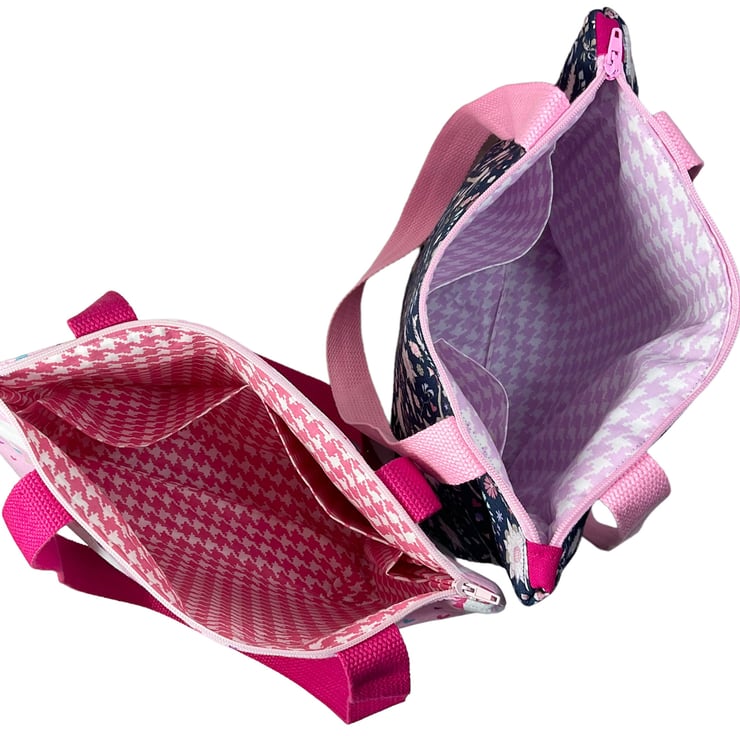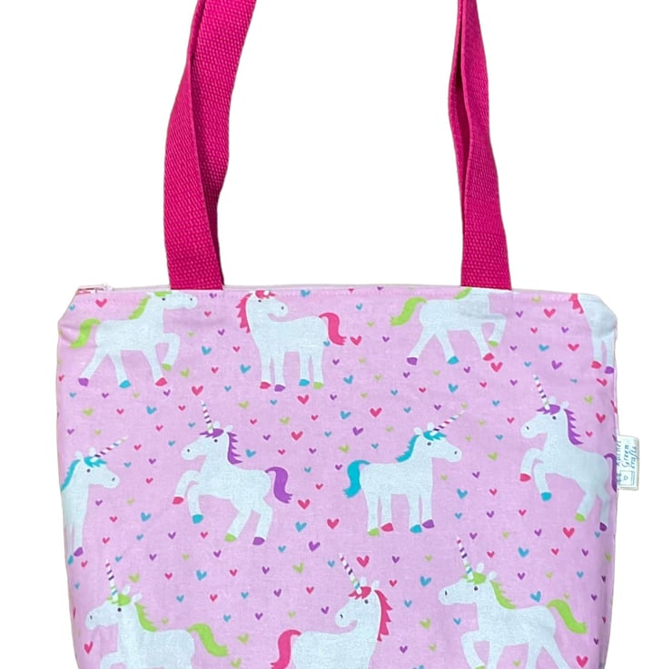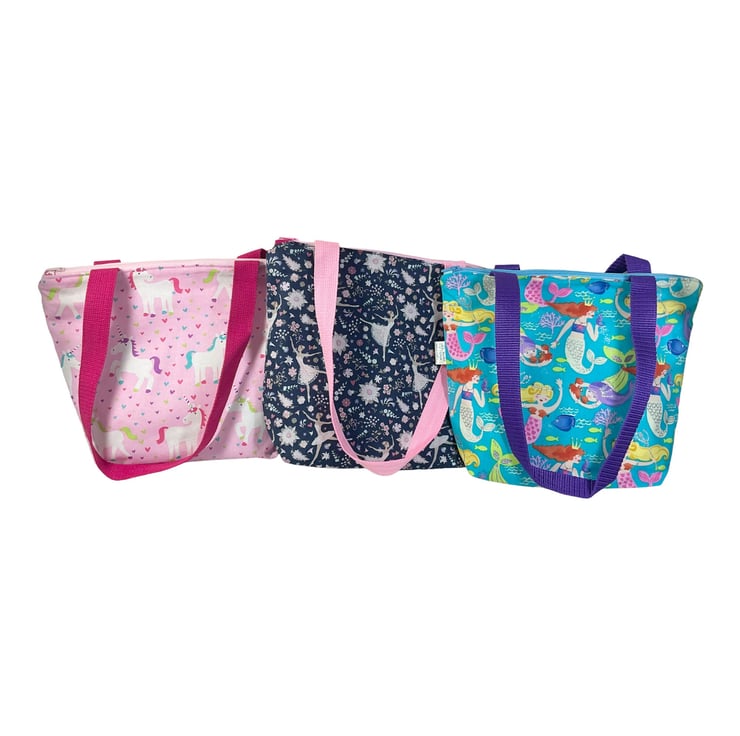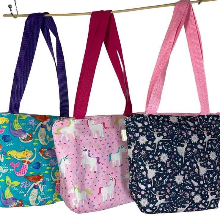 A choice of small cotton tote bags all in in the cutest fabric. First we have pretty mermaids that has accents of silver glitter in the print. The fabric has swimming mermaids in vibrant colours on a deep turquoise blue background. I have fully lined the bag in turquoise cotton with a white triangle print pattern. Next is pretty ballerinas and small floral print on a navy base, this is lined in pale pink and white dogtooth check. Finally is the oh so cute unicorn print on a candy pink base, this is lined in old rose pink and white dogtooth check.