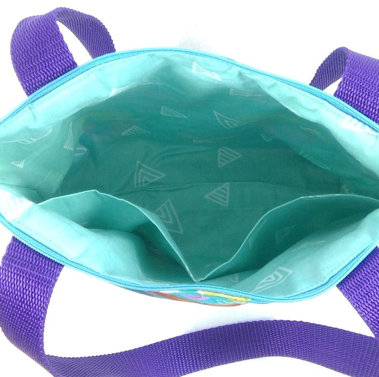 The handles are made from nylon heavyweight strapping in deep violet on the mermaids and in pale pink cotton on the ballerina, cerise pink cottage on the unicorn. The corners of the bag are boxed so it stands on its own, also helped by the fact the bag is fully interfaced.