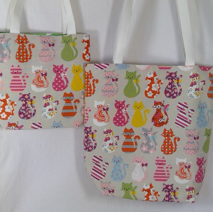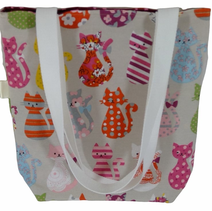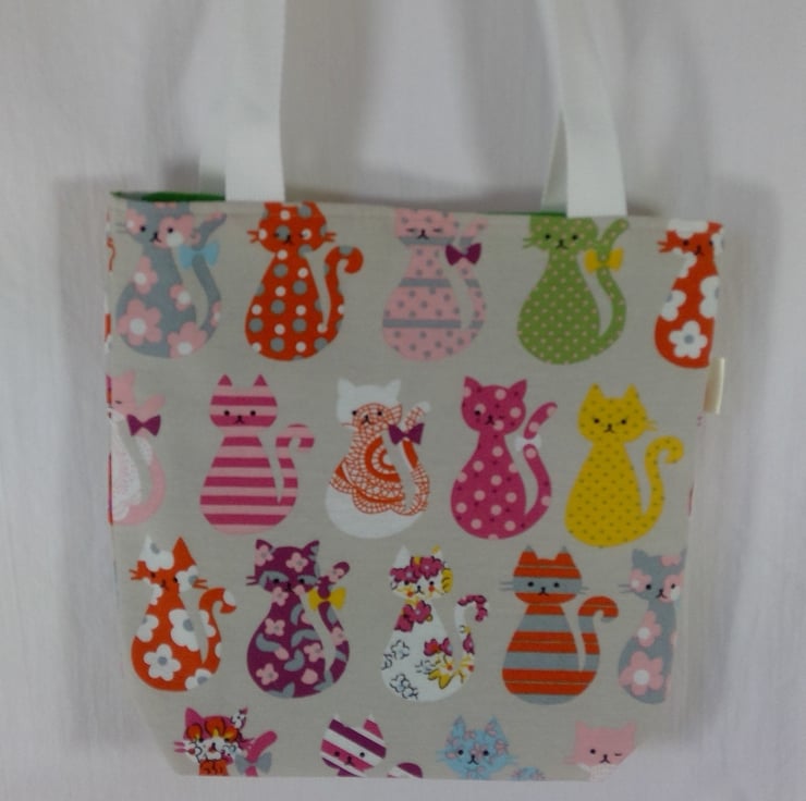 A small cotton tote bag, in the cutest colourful cat print fabric on a light beige background that would be a wonderful small bag for ladies or girls.