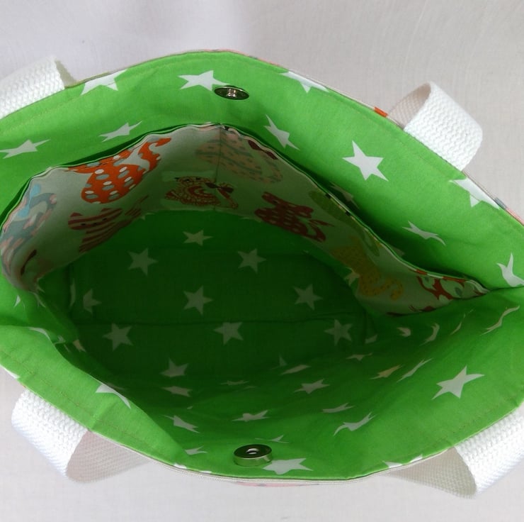 The fabric outer layer is a heavyweight cotton canvas and the lining is bright green with white stars cotton. Inside is a full width set of pockets,split into 2 slip pockets. The bag fastens with a magnetic snap.