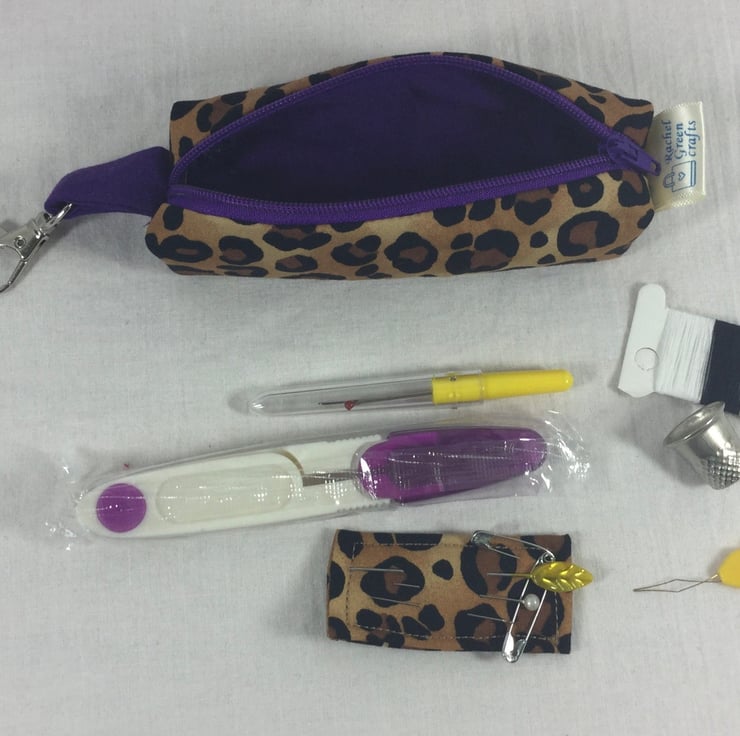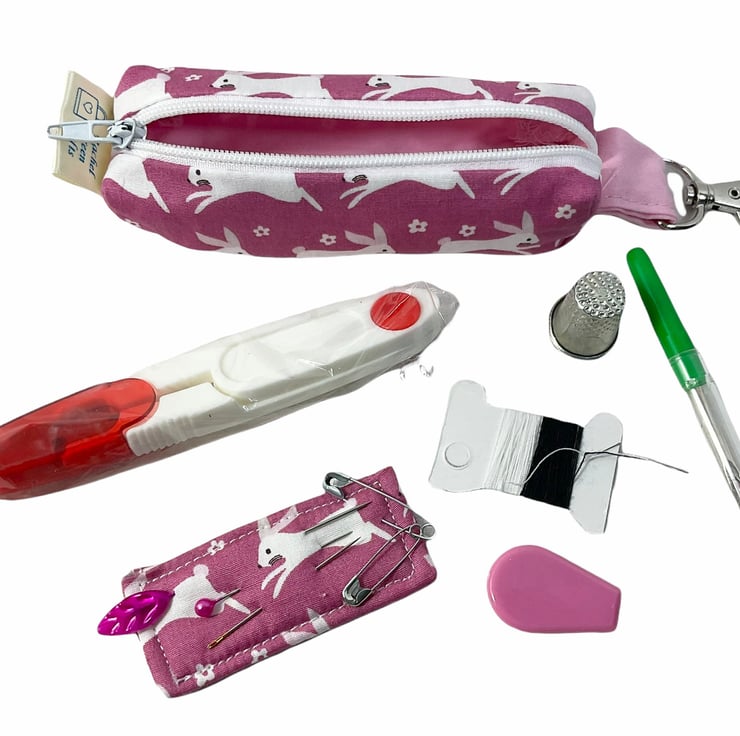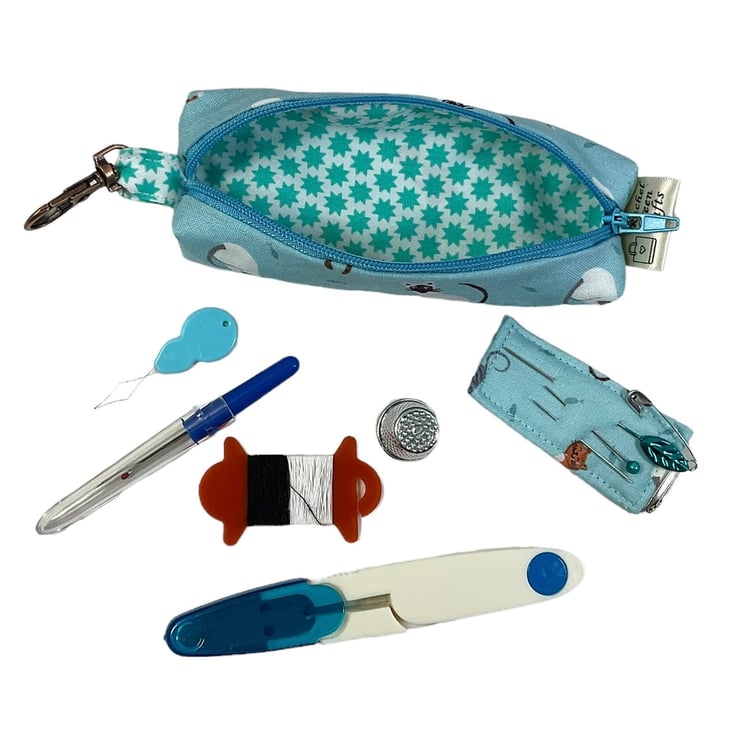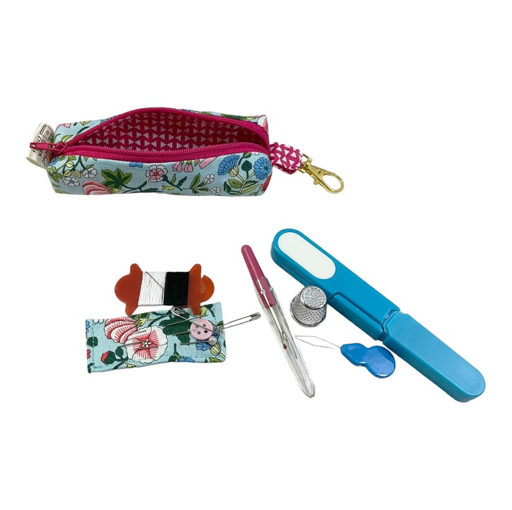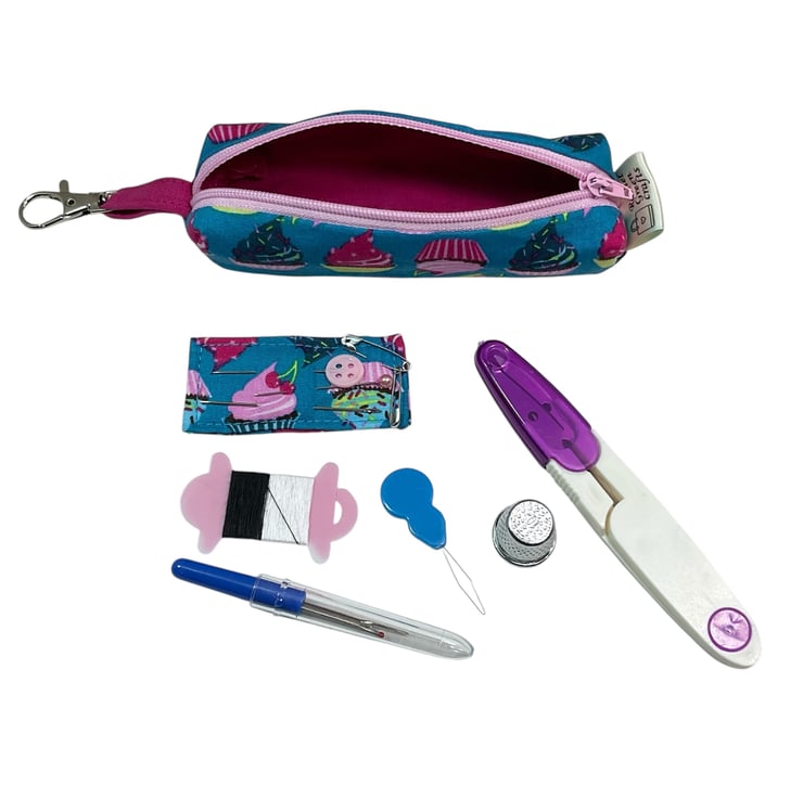 Inside you will find a fabric matched pincushion with a padded reverse that holds 2 novelty pins, 2 safety pins and a sewing needle. Also a pair of folding scissors, a card with black and white sewing thread, a thimble, a stitch unpicker and a needle threader.