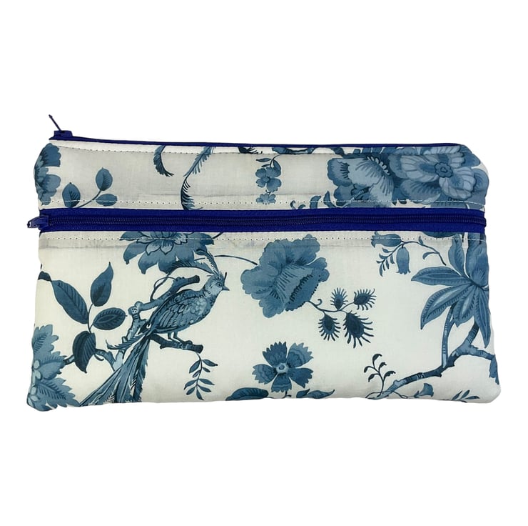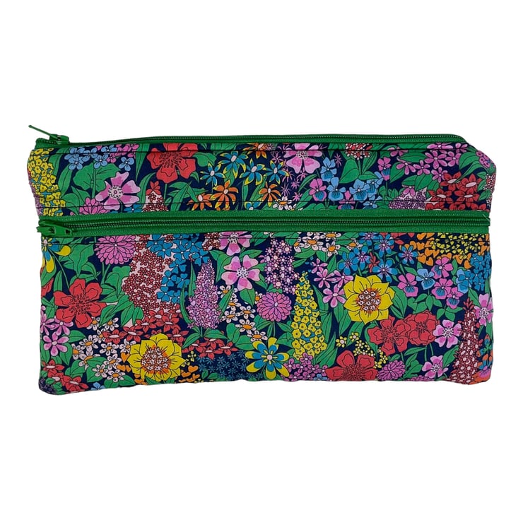 The main fabric is Libertys beautiful cotton tana lawn. Each case is lined fully in a water resistant fabric. This case has a handy second pocket on the outside so you can keep some items separate from the main compartment. There are two nylon zips in a coordinating colour. The entire case is wadded and interfaced offering great form and strength. The lower seams of the outer and lining are double sewn for strength.
