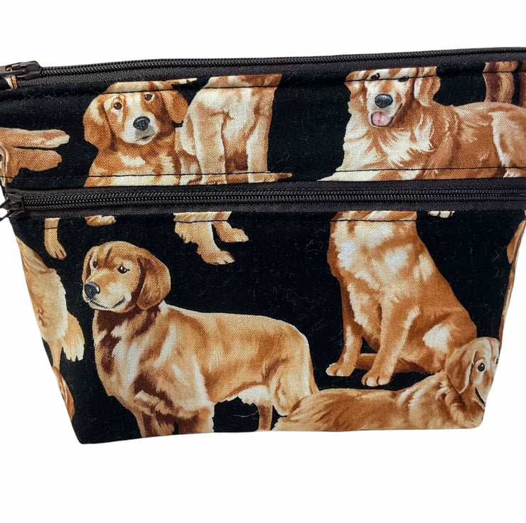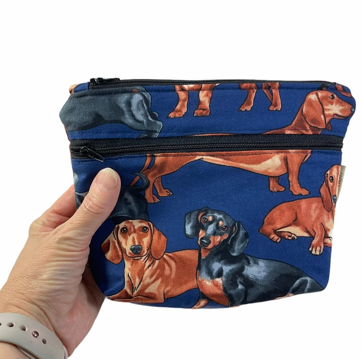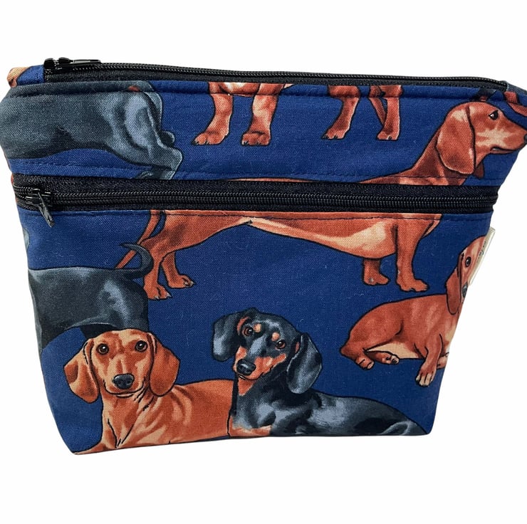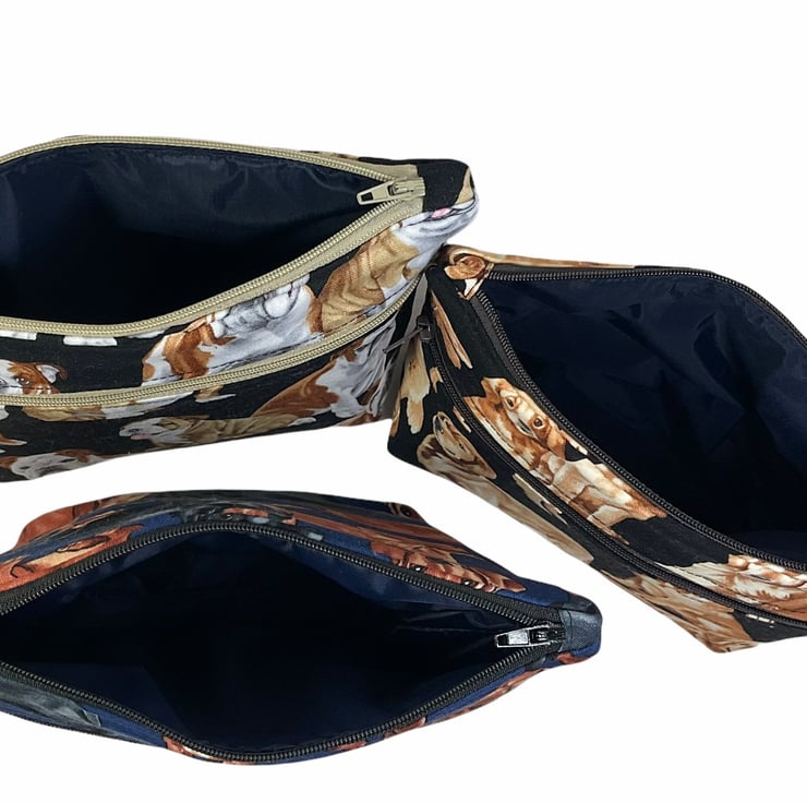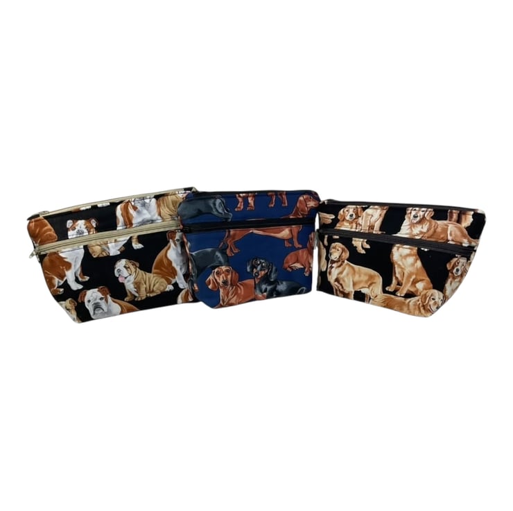 Oh so cute and very handy pouch with 2 pockets, a large internal and smaller outer. Both lined in water resistant fabric. A choice of 3 cotton dog prints, retriever, bulldog or daschund. All on dark bases- bulldog and retriever on black and daschund on navy blue. Useful for cosmetics, wash bag items or even crafting. All completely Lined in navy blue. Fully interfaced and wadded for good form. Pattern placement may vary.