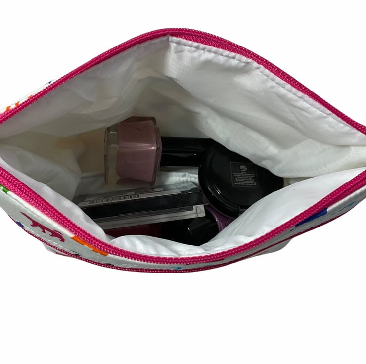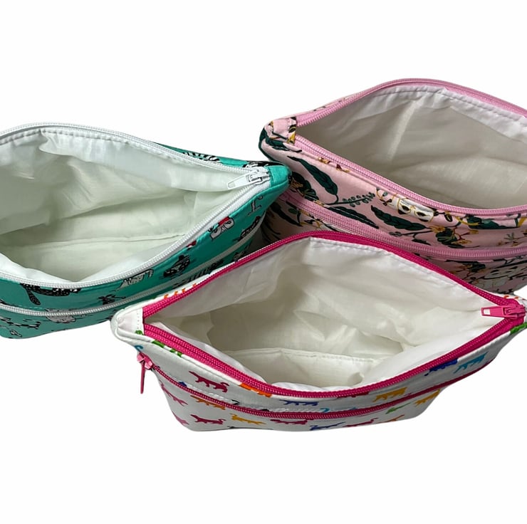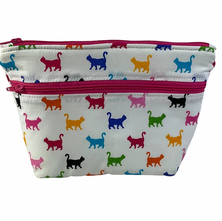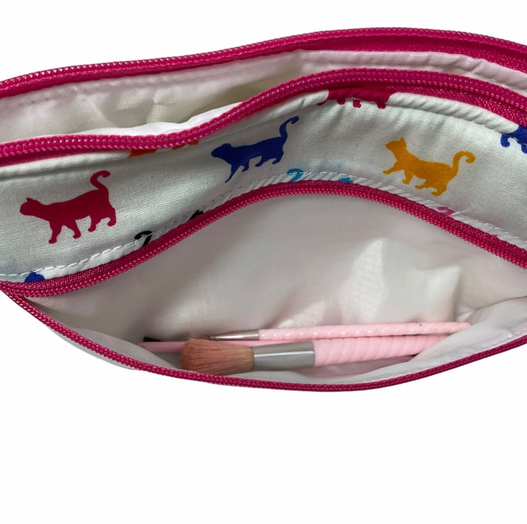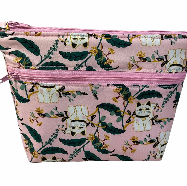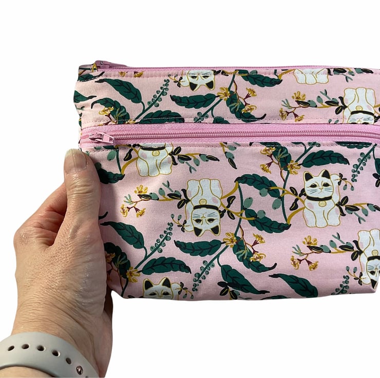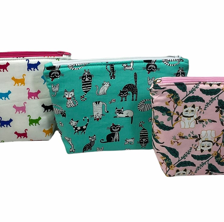 Oh so cute and very handy pouch with 2 pockets, a large internal and smaller outer. Both lined in water resistant fabric. A choice of 3 cotton cat prints, smart black and white on deep turquoise , colourful cats on a white base or fun Asian lucky cats on light pink base. Useful for cosmetics, wash bag items or even crafting. All completely Lined in white water resistant rip stop. Fully interfaced and wadded for good form.