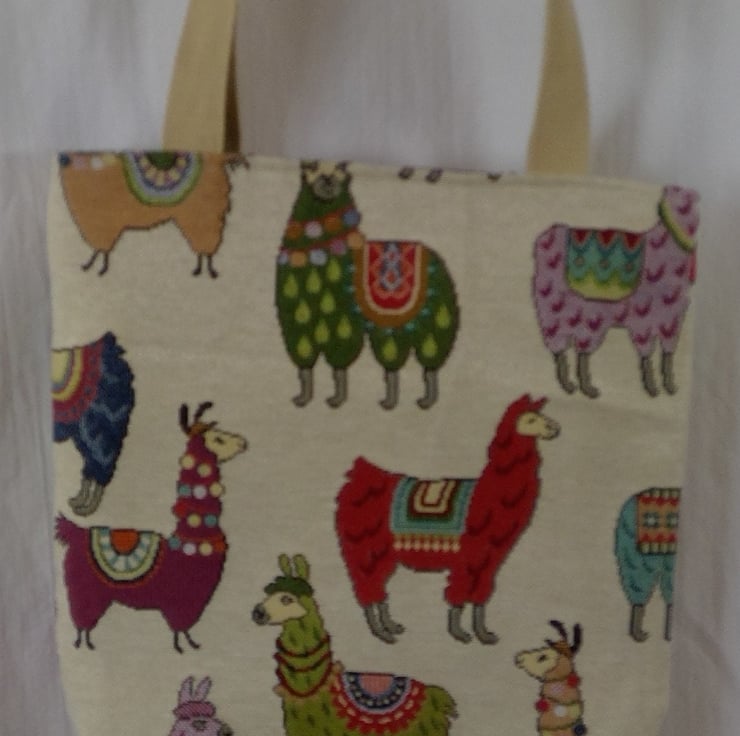 A small cotton tote bag, the outer in really lovely heavyweight 'tapestry' style cotton fabric. This would be a perfect small knitting bag, I have it filled with 3.5 50g balls of yarn and needles, plus my WIP (shown in alternative bag -this bag and contents not included in sale) and theres plenty more space! Obviously this would be a perfect everyday bag too, particularly for a sheep lover.