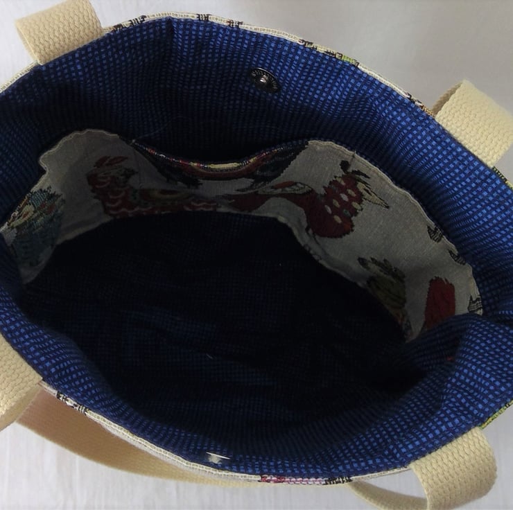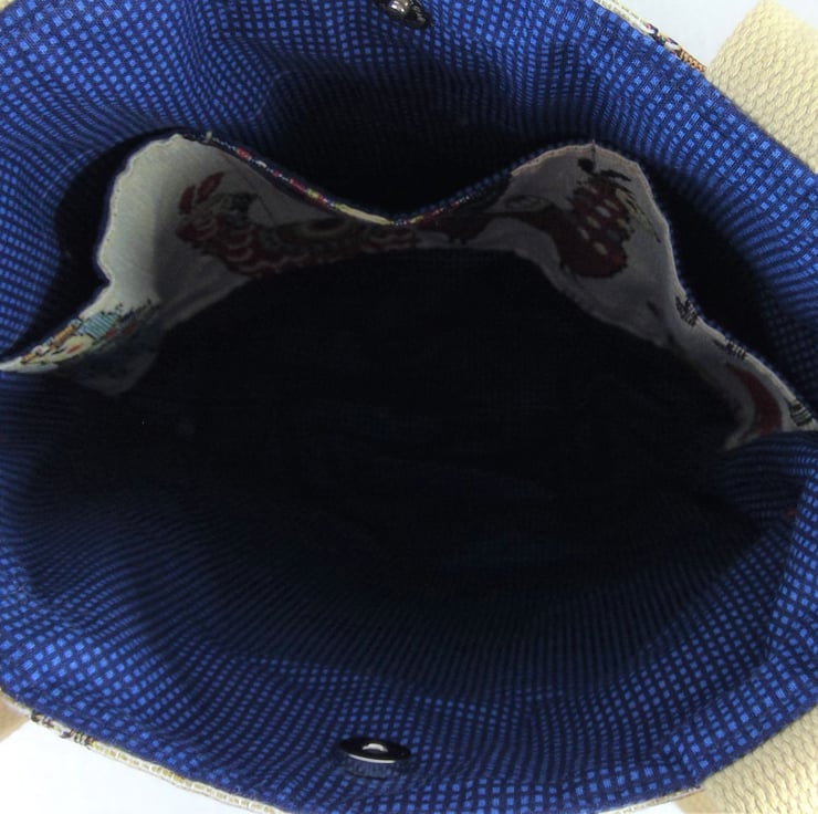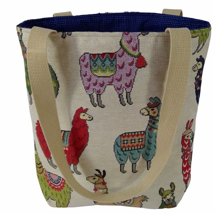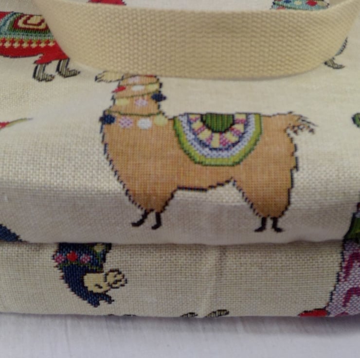 The fabric outer layer is a heavyweight cotton fabric with the cutest colourful llamas. The lining is navy and paler blue micro check pattern cotton. Inside is a full width set of pockets, split into 3 slip pockets. The bag fastens with a magnetic snap.