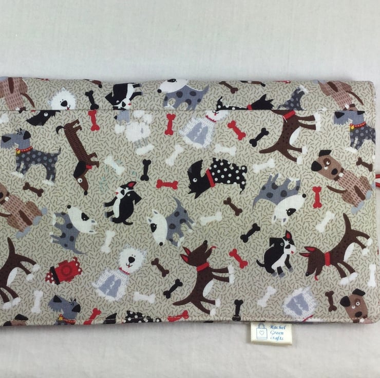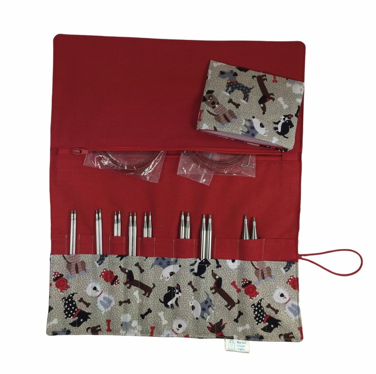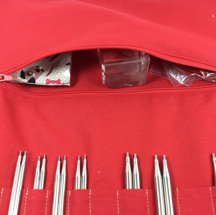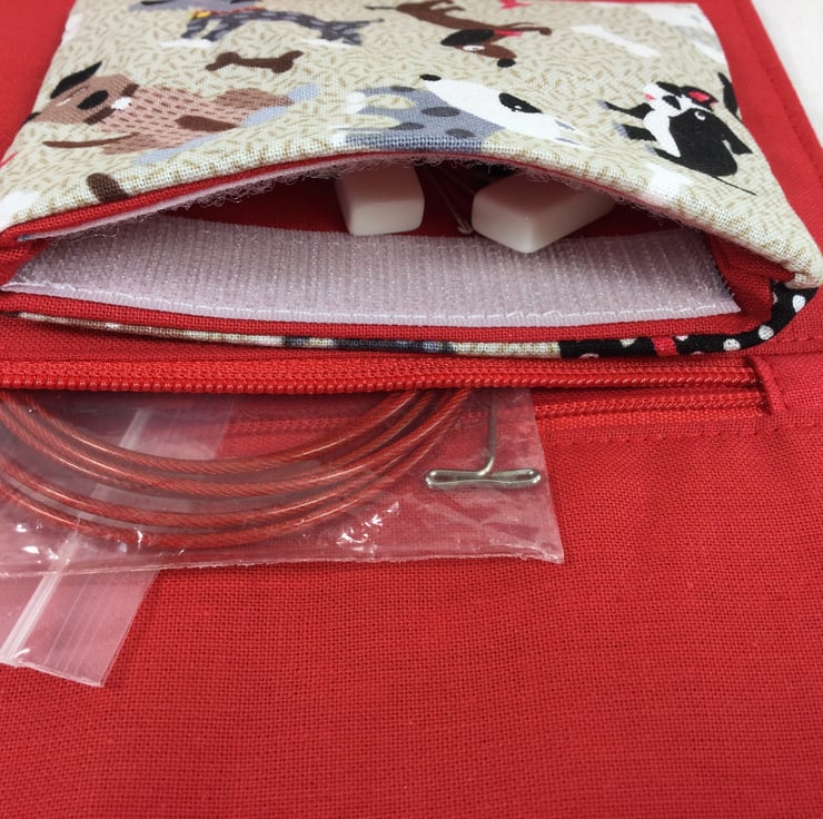 The case is made in a really lovely dogs cotton fabric and lined in a bright red cotton. The flap to cover the needles doubles up as a generously sized zip pocket that will easily hold several cables. This case comes with its own fabric matched, mini hook and loop closing pouch. This can hold all those tiny stoppers and items.