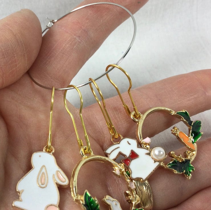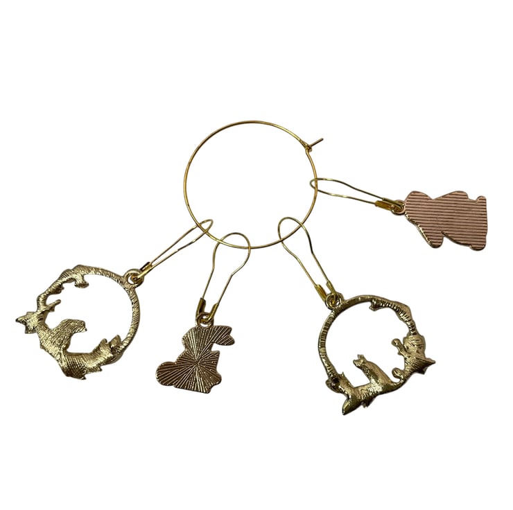 The charms themselves are gold plated as are the locking pins they are attached to. Due to the pins being able to open, these work equally well for knitting and crochet. One of the rabbit charms has a tiny Pearl for a tail, whilst the other rabbit sports a jaunty red bow tie. The other 2 charms are detailed rings, one having a carrot the other a tiny rabbit.