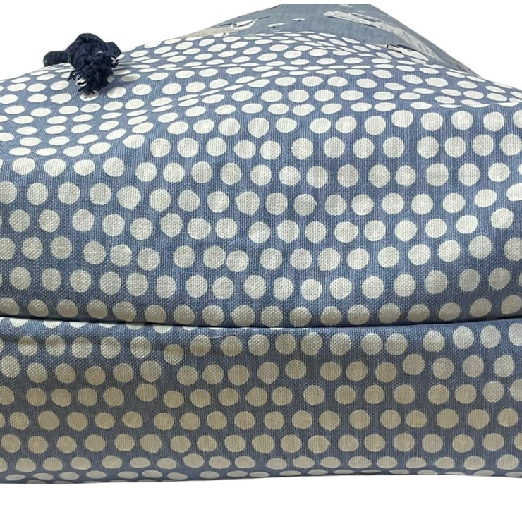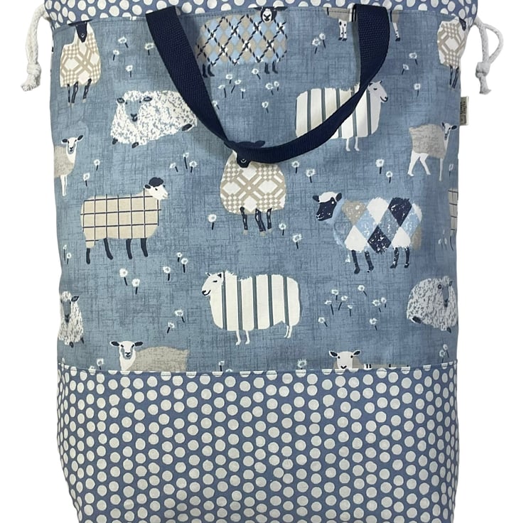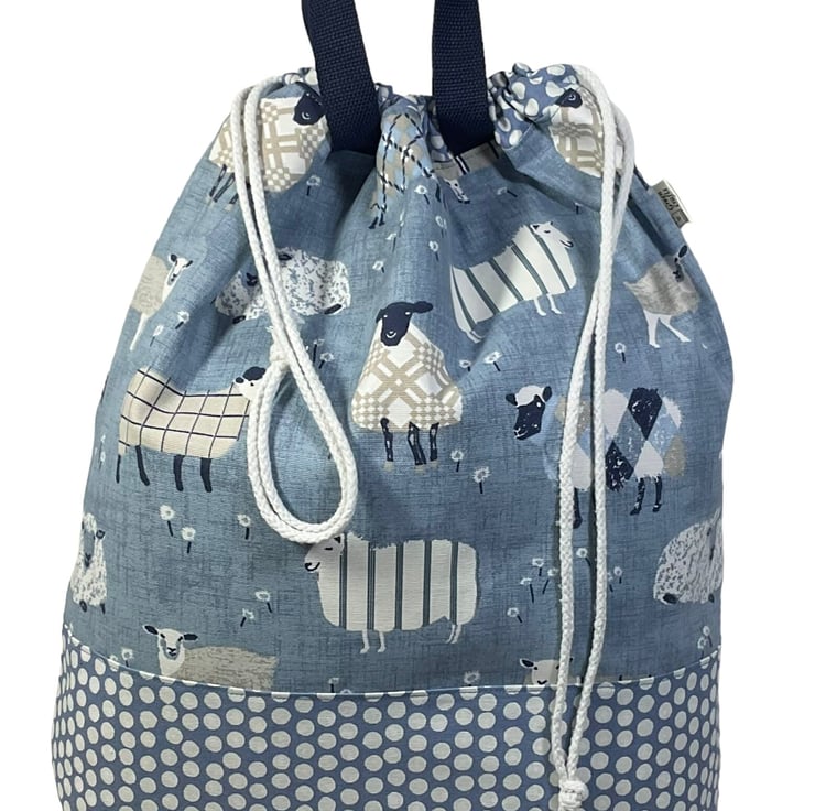 The main fabric is a lovely heavyweight sheep print on a denim blue base ( pattern placement may vary) and I have paired it with a heavyweight denim blue with white spots cotton. Inside the bag is lined with a natural cotton and around the whole circumference are pockets in varying widths, a total of 5, 2 being perfect for needles up to approximately 35cm (14) in length, longer if you allow them to poke out of the top! The others work well for notions, patterns etc. There is also a lobster clasp on webbing perfect for holding stitch markers or maybe keys.
