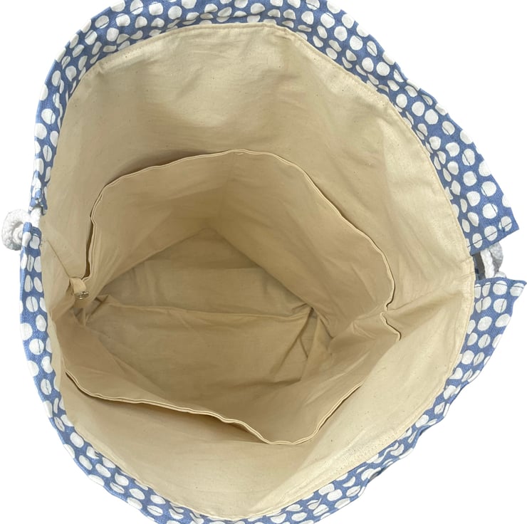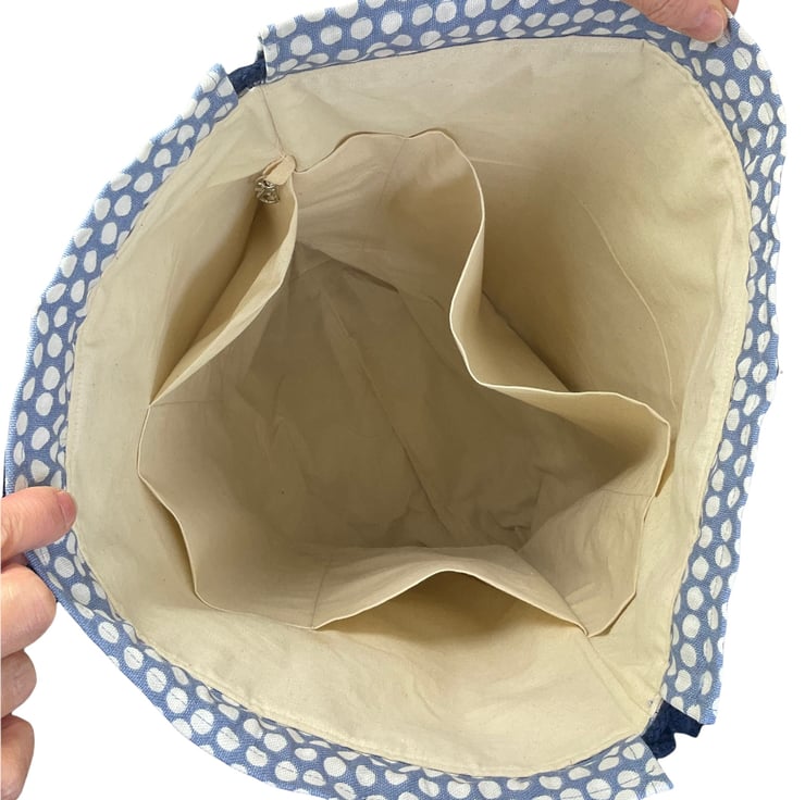 On the top are 2 strong navy blue cotton webbing handles to carry and it closes with 2 plaited cotton drawstrings that close by pulling each end.